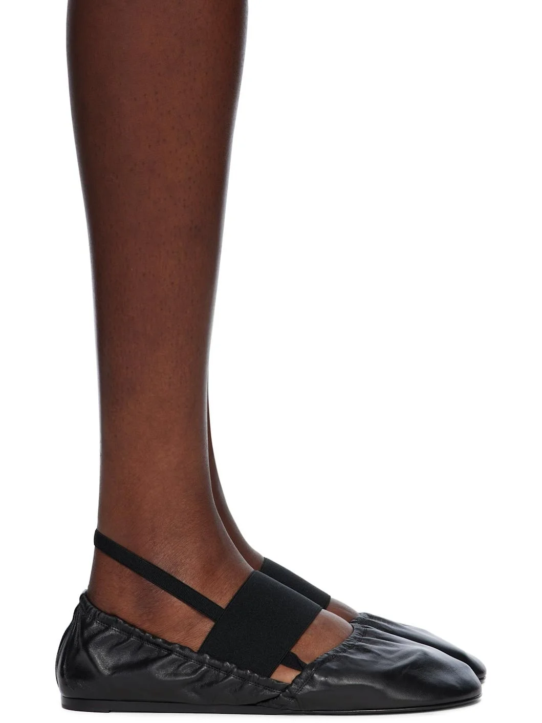 Buffed lambskin Mary Jane-style ballerina flats in black. · Gathering throughout · Elasticized vamp and slingback strap · Logo stamp at padded leather footbed · Buffed leather lining · Polished leather sole with rubber injection Supplier color: Black Upper: lambskin. Sole: leather, rubber. Made in Italy 251288F118011