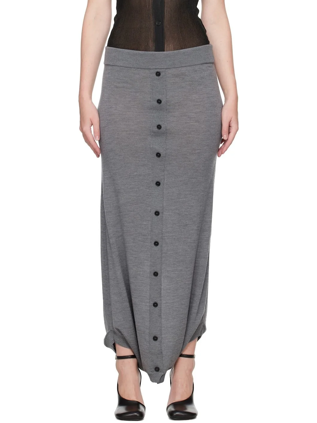 Knit merino wool maxi skirt. · Rib-knit waistband and hem · Button hardware at front · Cutout at side seams · Central vent at back hem Supplier color: Grey chine 100% merino wool. Made in Belgium 251288F093006