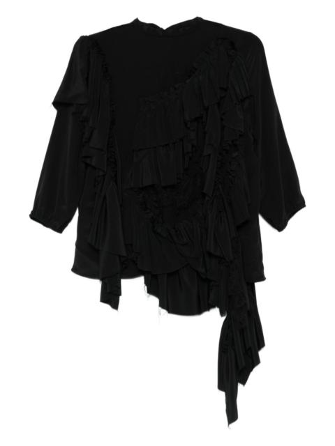 ruffled asymmetric top Highlights - Black - Ruffled detailing - Asymmetric hem - Round neck - Three-quarter sleeves - Raw-cut edges Imported Composition Silk 100% SIZE & FIT Model measurements Height 5 ft 9 in(1.75 m) Bust/Chest 34.64 in(88 cm) Hips 36.61 in(93 cm) Waist 26.37 in(67 cm) Washing instructions Read Manufacturer Guidelines