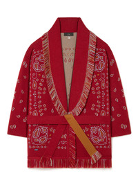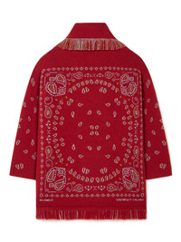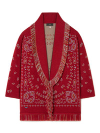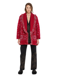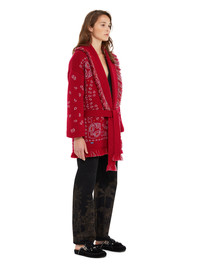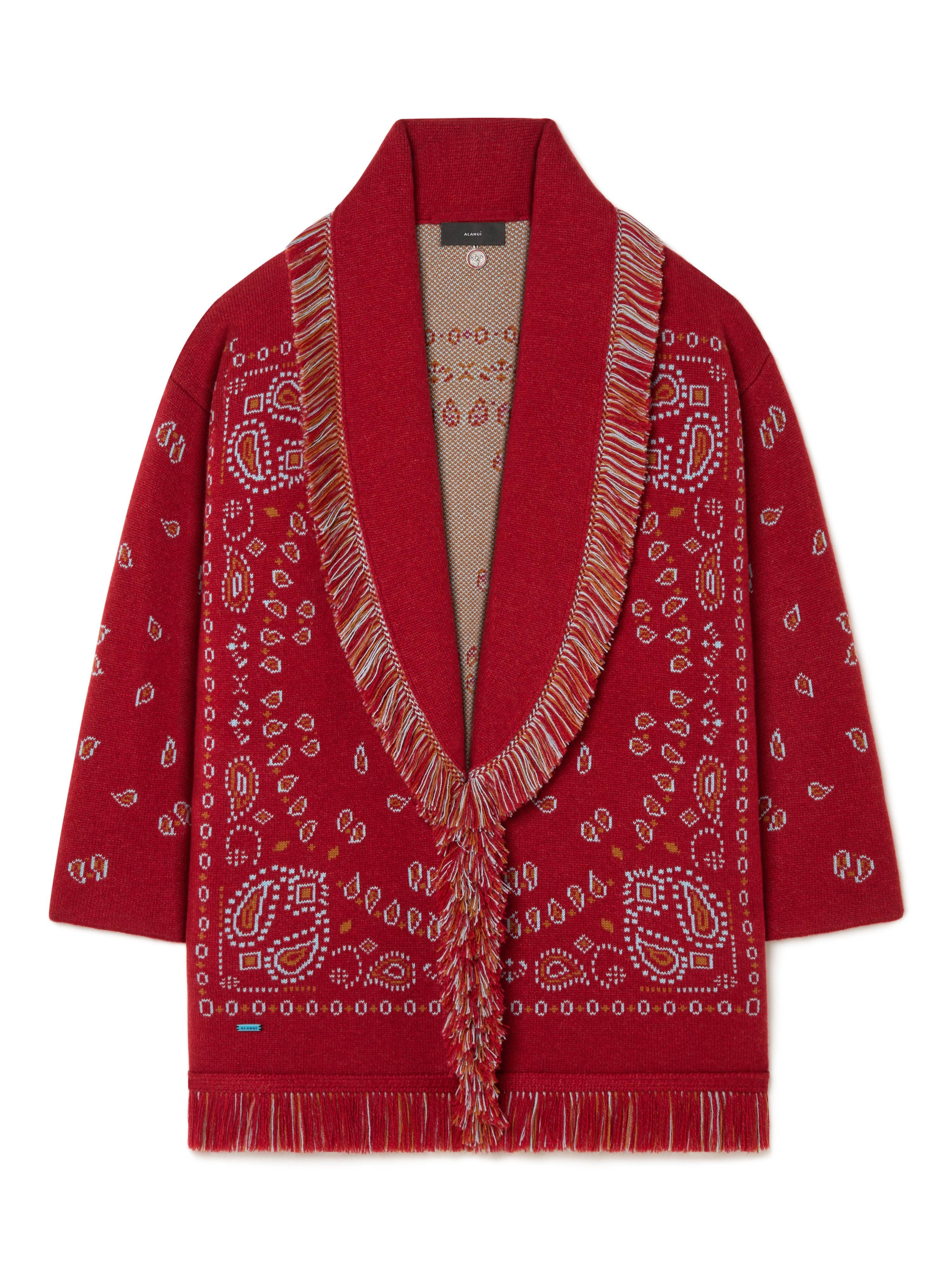 A bold fusion of two signature Alanui styles, the Bandana Jacquard Cardigan is a standout piece for any wardrobe. Lovingly crafted from 100% cashmere using double jacquard knit, each cardigan pairs the original Icon fit with the iconic Bandana Pattern to create a true statement look. Complete with two-tone tie belt and multicolored fringed edges. DETAILS - Product Code LWHB064R25KNI0012817 - Made In Italy - Crafted from 100% Cashmere. - This item weighs 1200 gr and takes four hours to be knitted and another six to be assembled. - The model is 180 cm and wears a size M. - This item fits true to size.