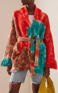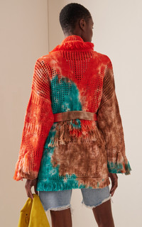 Carlotta and Nicolò Oddi, the cool brother-sister duo behind the Italian label, return with their desert-chic, chunky knits—now a cult favorite—in Southwestern-tinged, frayed-hem cardigans and equally cozy separates. The 'California Dreamin' cardigan has a netted construction knit from tie-dyed wool with a signature fringed shawl collar. Wear it with or without the belt. PRODUCT DETAILS - Tie fastening - Composition: 57% cotton, 19% polyamide, 16% polyester, 5% linen, 3% wool - Dry clean - Made in Italy SIZE & FIT - Fits true to size, our fit specialist recommends taking your normal size - Designed for a relaxed fit