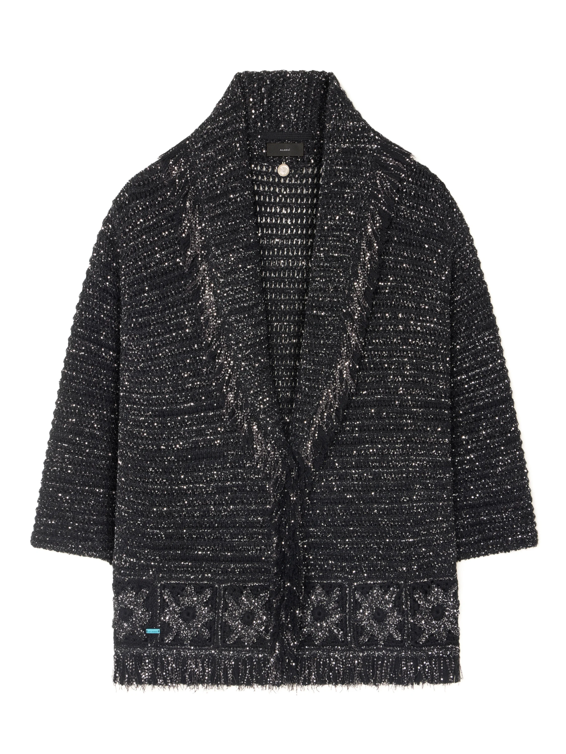 No trip around the world would be complete without a stop in New York City. Alanui channels the metropolitan sparkle of the Big Apple with the City Lights Cardigan, using a sequined yarn crafted to create a crochet effect. Hand-crocheted sequin flowers adorn the border of the Icon style. Finished with a matching tie-belt and sequined fringed edges. DETAILS - Product Code LWHB064E25KNI0061078 - Crafted from 54% Wool 24% Polyammide 21% Polyester. - The model is 178 CM and wears a size M/L. - This item fits true to size.