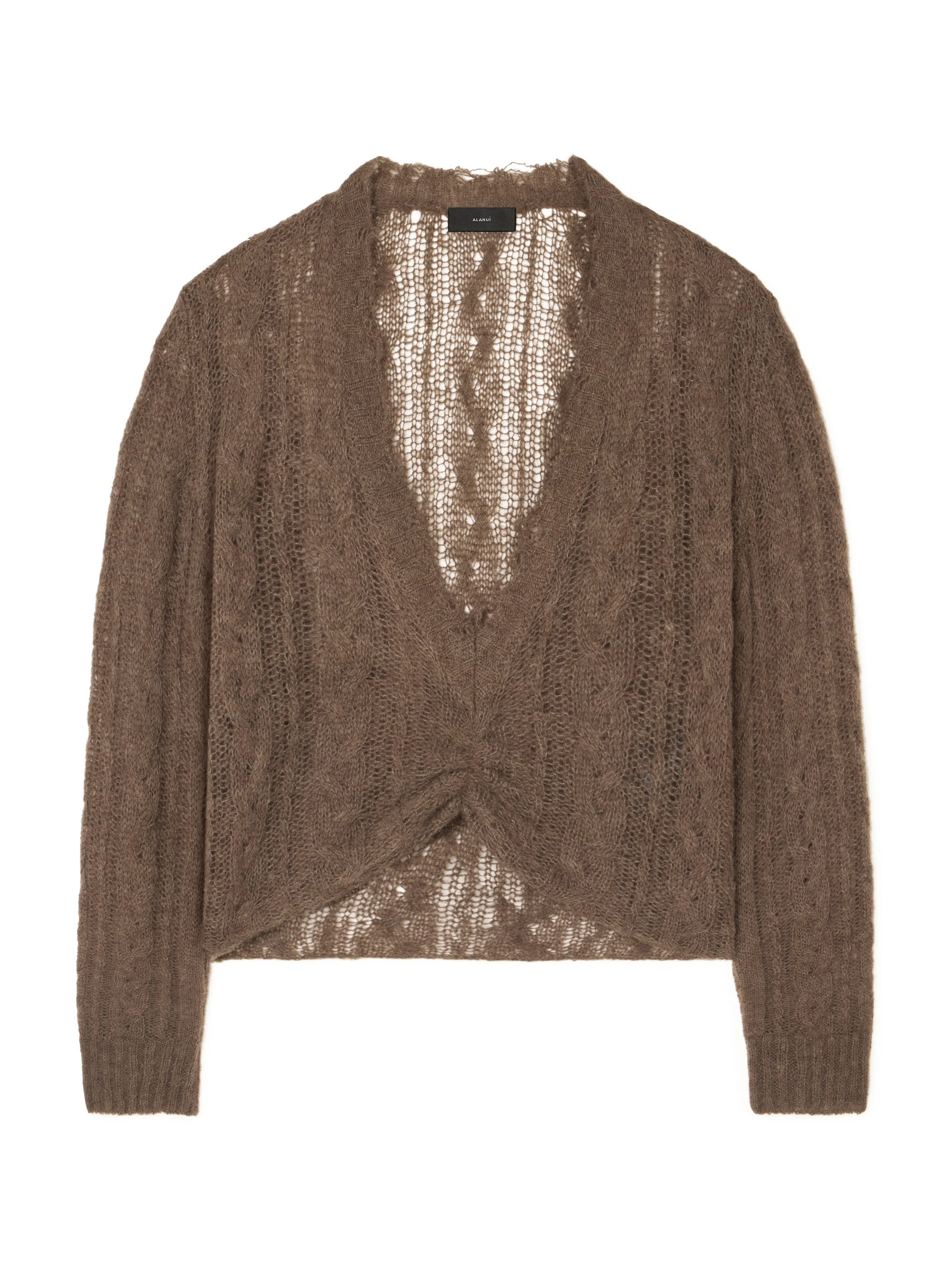 This Fall / Winter 2025, Alanui heads to the wilds of California. Inspired by the spirit of desert wanderers, the Desert Drift Cardigan V Neck features a draped V-neck style in a barely-there baby alpaca, cashmere, and silk blend. A braided motif in all-over cable stitch and distressed detailing evoke a lived-in feel. DETAILS - Product Code LWHD001E25KNI0016000 - Crafted from 40% Alpaca 30% Cashmere 30% Silk. - The model is 178 CM and wears a size M. - This item fits true to size.