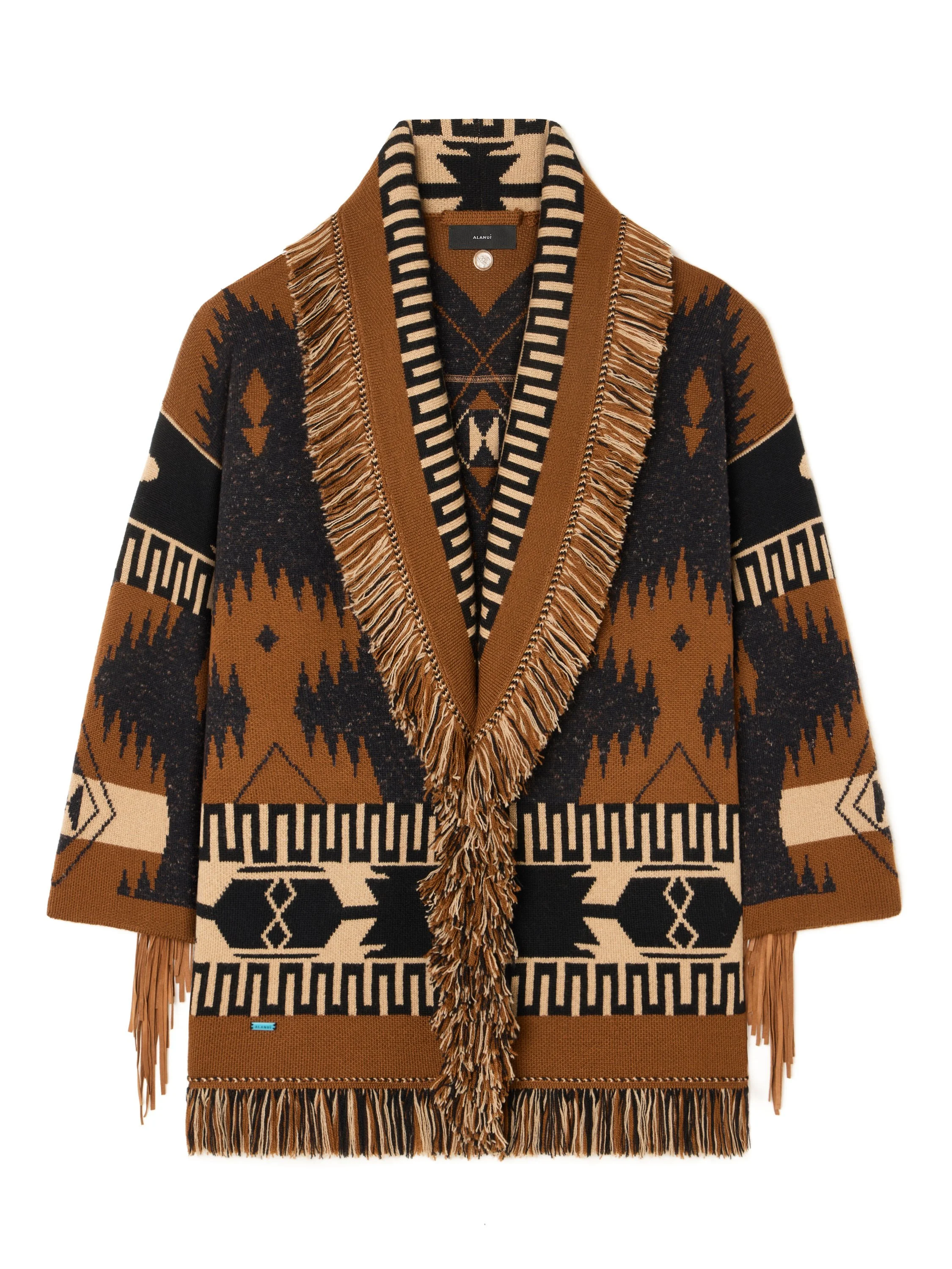 This Fall / Winter 2025, Alanui sets off on a trip around the world, traveling eastbound to the wilds of California. Crafted from a wool and linen blend using intricate double jacquard knit, the Dreamscape Cardigan embellishes the original Icon style with suede fringes in a luxurious take on Americana style. Finished with a two-tone tie belt and multicolored fringed edges. DETAILS - Product Code LWHB064E25KNI00H1060 - Crafted from 87% Virgin Wool 11% Polyamide 2% Linen Fringes: 100% Leather. - The model is 178 CM and wears a size M. - This item fits true to size.