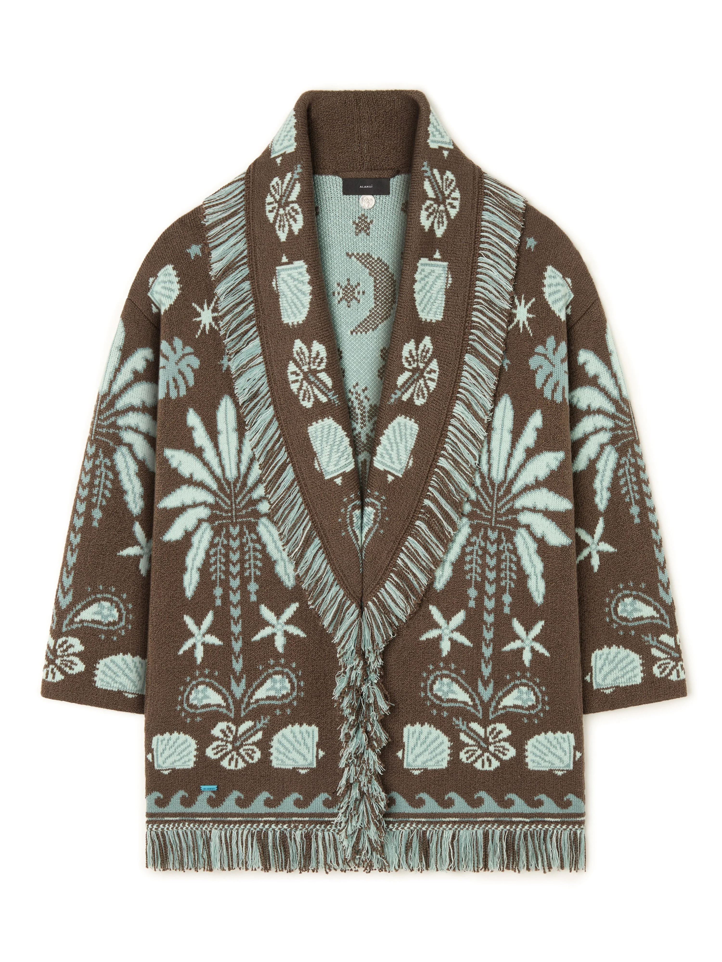 This Spring / Summer 2026, Alanui dives into the mystical allure of French Polynesia. The Echoes of the Island Cardigan captures the island’s natural harmony in a textured, island-inspired foulard motif in double jacquard knit. Crafted in Italy from a cotton and wool blend, it features the original Icon fit, a matching tie belt, and fringed edges. DETAILS - Product Code LWHB064R26KNI0036041 - Crafted from 60% Wool 40% Cotton Product weight: 1100 grTaking three hours to be knitted and another six to be assembled. - The model is 180 cm and wears a size M. - The item fits true to size.