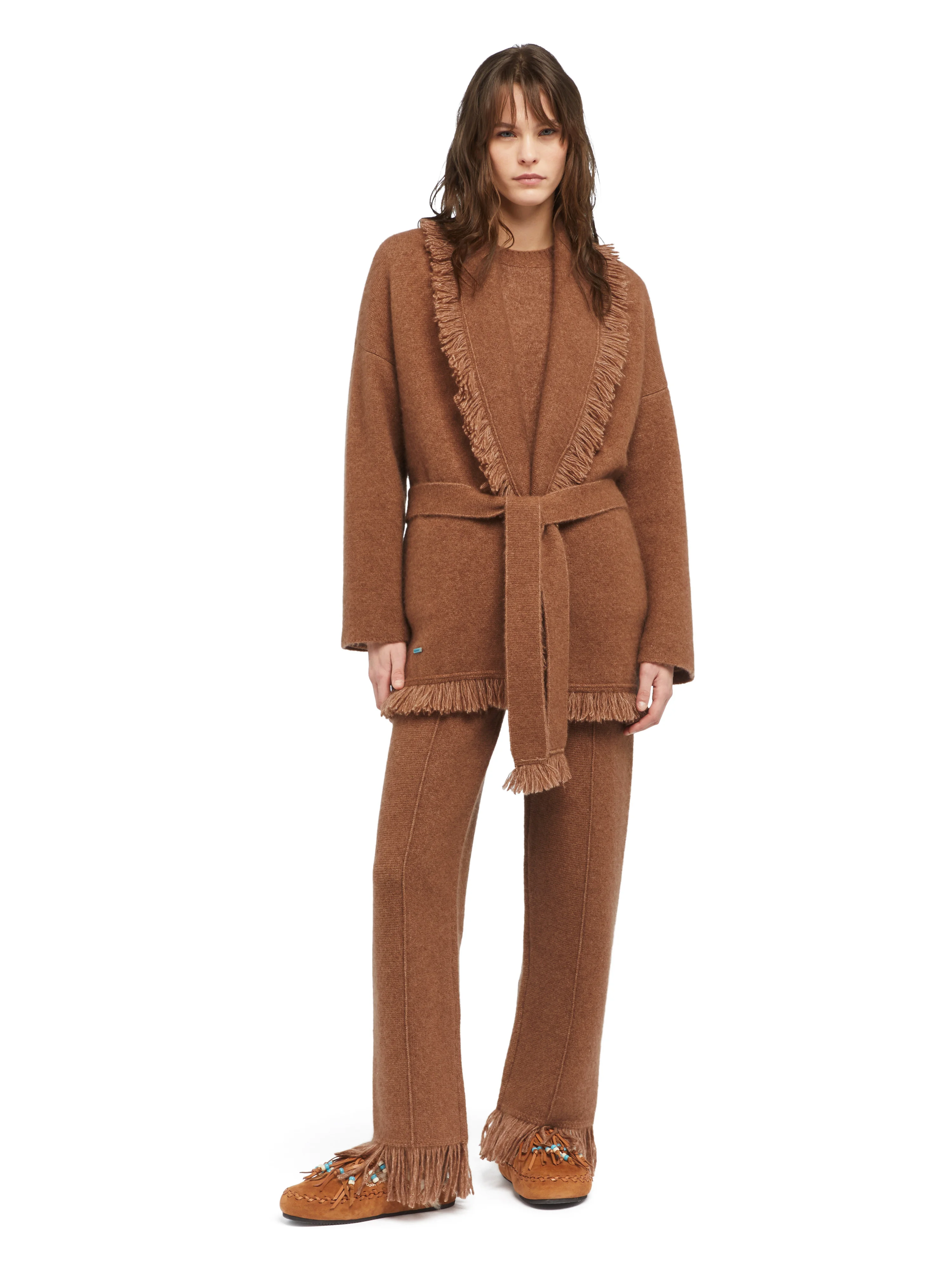 Jewel in the Alanui crown, the premium Finest line takes signature craftsmanship to new heights. Each piece is meticulously crafted using expert knitting techniques for luxurious comfort and enduring appeal. The Alanui Finest Cardigan pairs the original Icon fit with the incredibly soft sensation of a cashmere and silk blend in Milano stitch. Finished with a matching tie belt and fringed edges. DETAILS - Product Code LWHB064E25KNI00E6200 - Crafted from 71% Cashmere 19% Silk 10% Polyester. - The model is 176 CM and wears a size M. - This item fits true to size.
