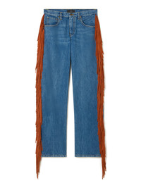 This Spring / Summer 2026, Alanui investigates the elusive quality of light. Crafted in Italy from medium-wash denim, the Golden Dusk Denim Pants channel the warmth of the setting sun into a classic style, with soft suede fringing cascading like rays of light. DETAILS - Product Code LWYA019R26DEN0014764 - Crafted from 100% Cotton Fringes 100% Calf Leather Product weight: 880 gr - The model is 177 cm and wears a size 27 - The item fits true to size.