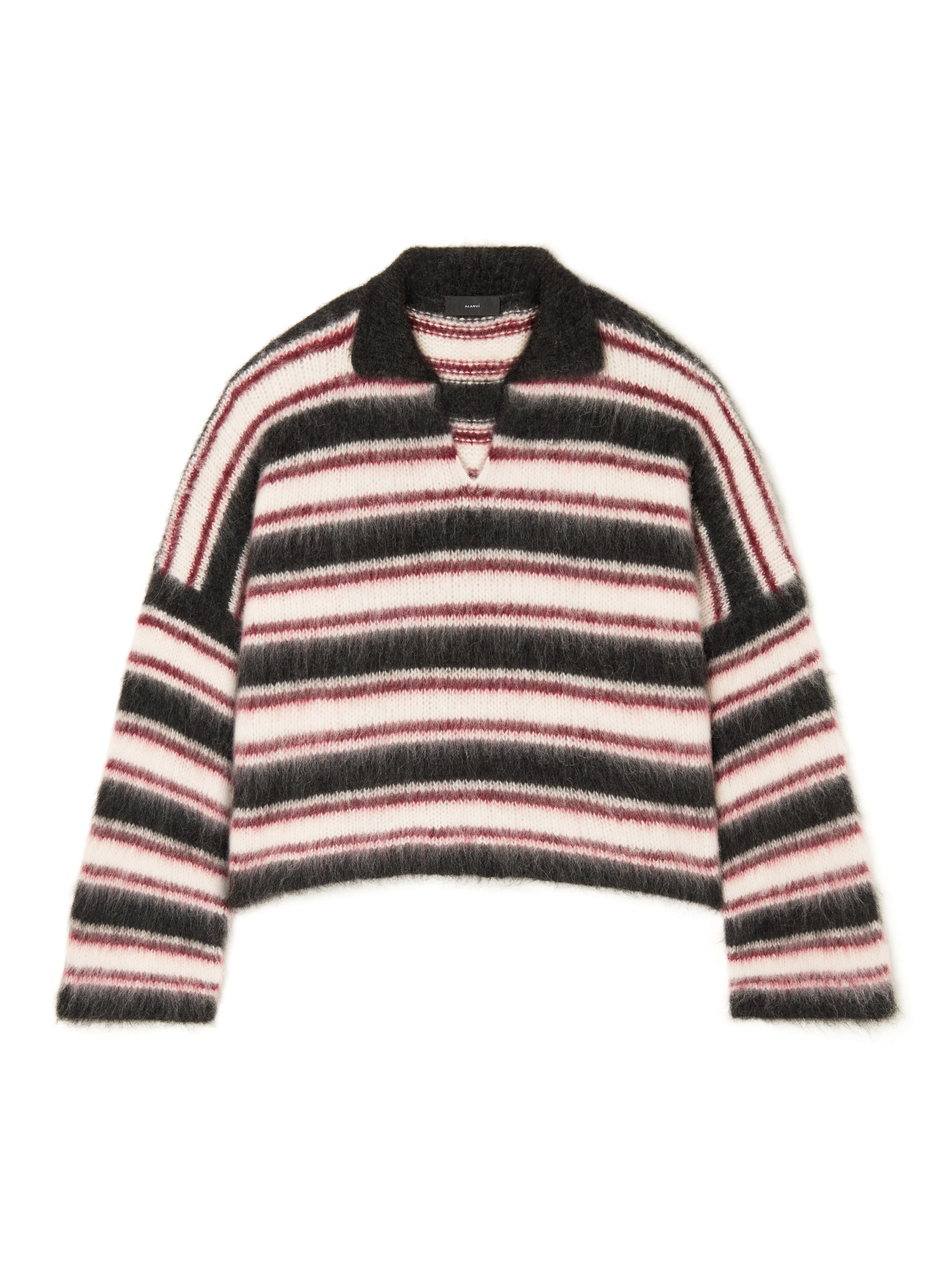This Fall / Winter 2025, a trip around the world takes Alanui to Seattle. A direct nod to the underground scene, the Grunge Stripes Polo revives a signature look with two-tone stripes in a brushed alpaca blend for a soft, worn-in feel. DETAILS - Product Code LWHV007E25KNI001070F - Crafted from 55% Alpaca 10% Wool25% Polyammide. - The model is 180 CM and wears a size M. - This item fits oversize.