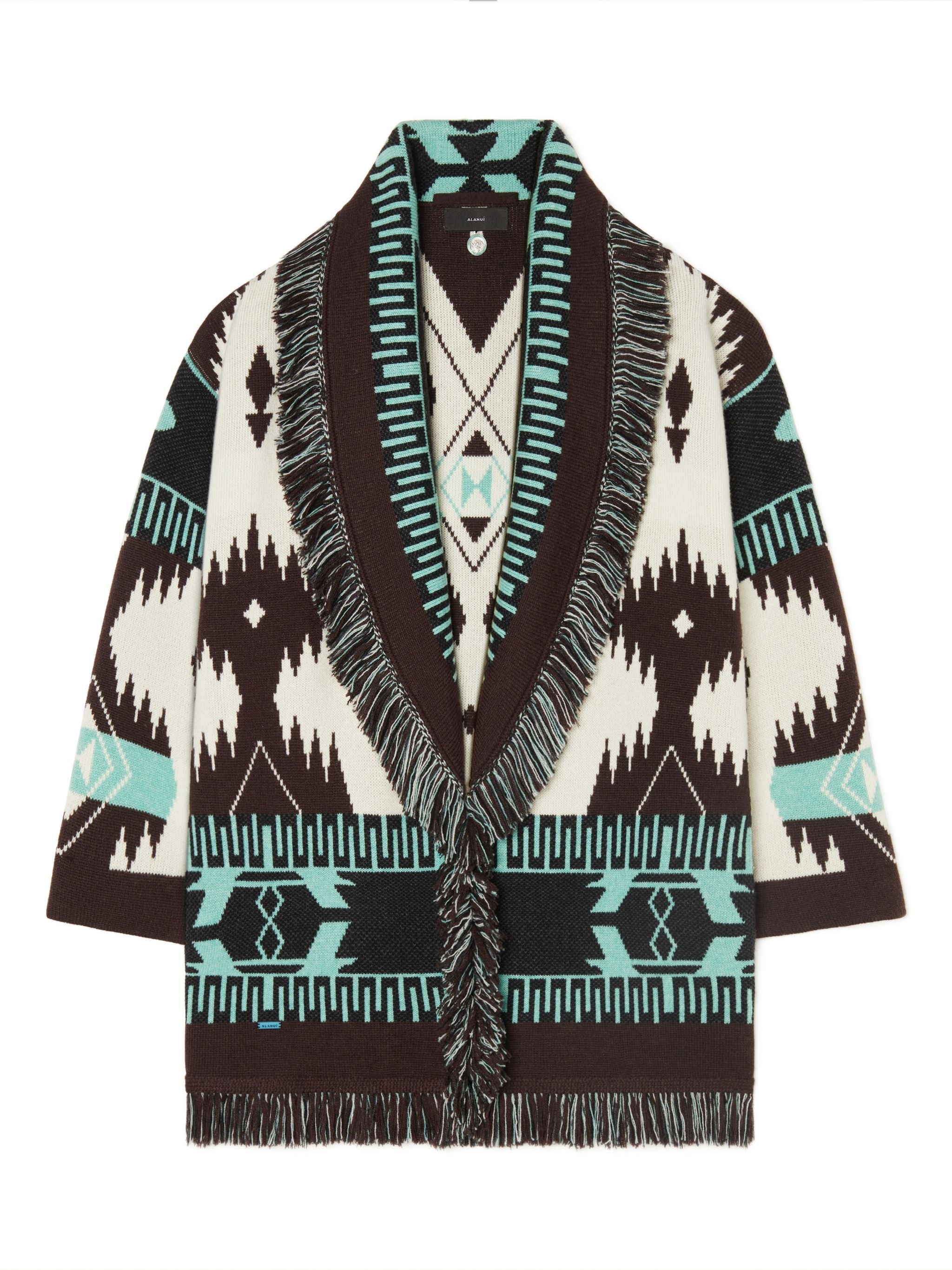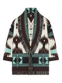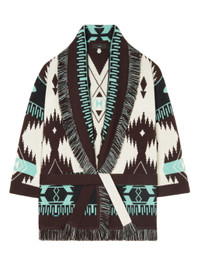 A signature style that gets better with every adventure, the Icon Jacquard Cardigan is the wardrobe staple that was made for traveling. Pairing the original Icon fit with the Iconic Alanui Pattern to create a timeless luxury style, each cardigan is lovingly crafted from 100% cashmere using double jacquard knit. Featuring signature two-tone tie belt and multicolored fringed edges. PRODUCT DETAILS Product Code LWHB064F23KNI0010360 Made in Italy Crafted from 100% Cashmere. This item weighs 1.05 kg and takes ten hours to be complete. The model is 180 cm and wears a size M. This item fits true to size.