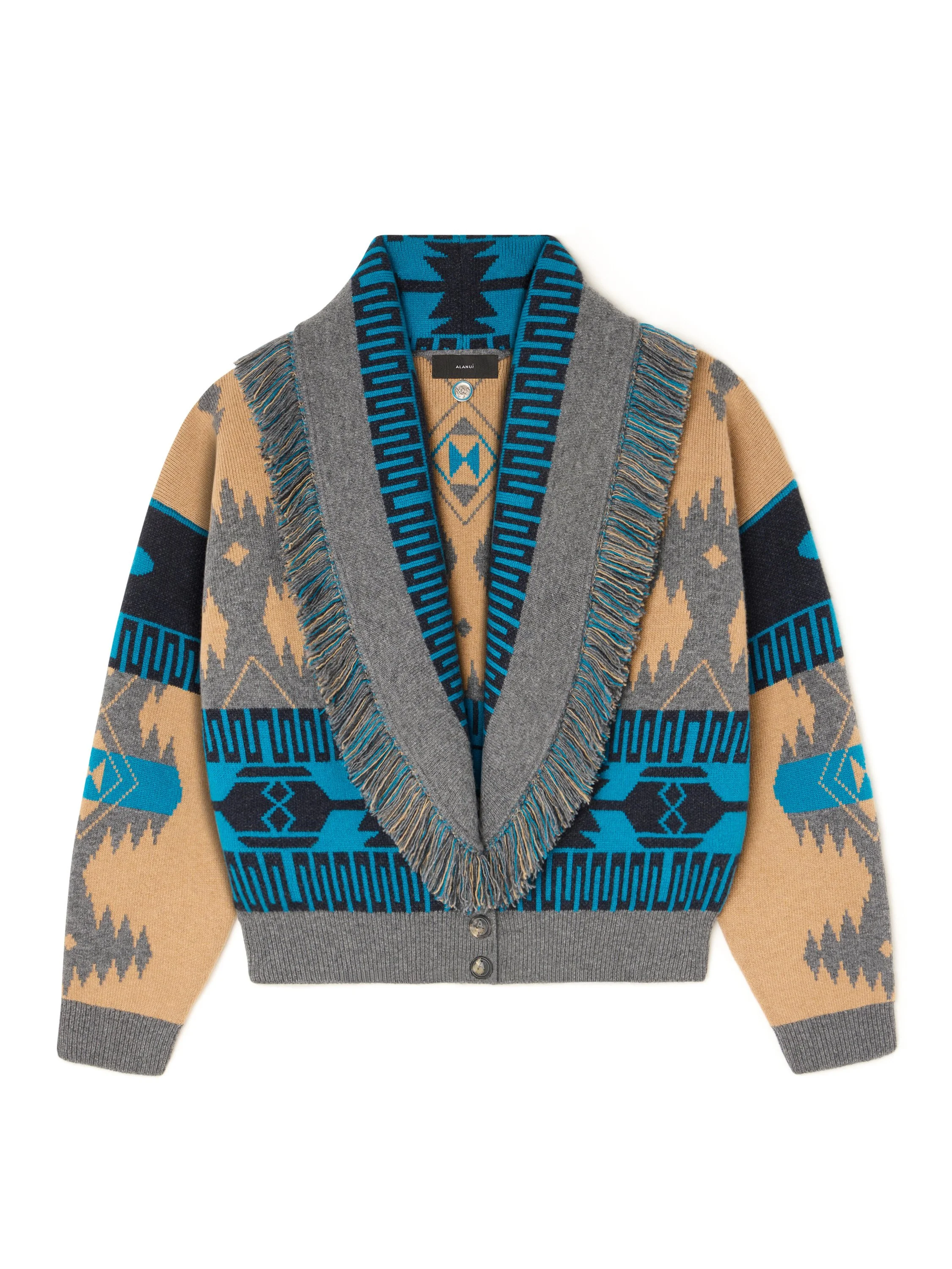 A contemporary take on the signature cardigan, the Icon Jacquard Cardi-Bomber pairs the iconic Alanui Pattern with a tailored cropped fit. Exquisitely crafted from cashmere and virgin wool using intricate double jacquard knit, the Cardi-Bomber features a multicolored fringed collar, ribbed trims, and real horn buttons. DETAILS - Product Code LWHB026E25KNI0026206 - Crafted from 70% Virgin Wool 30% Cashmere. - The model is 176 CM and wears a size M. - This item fits true to size.