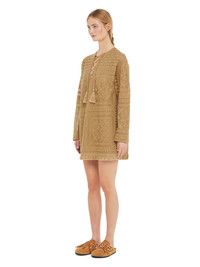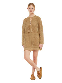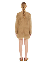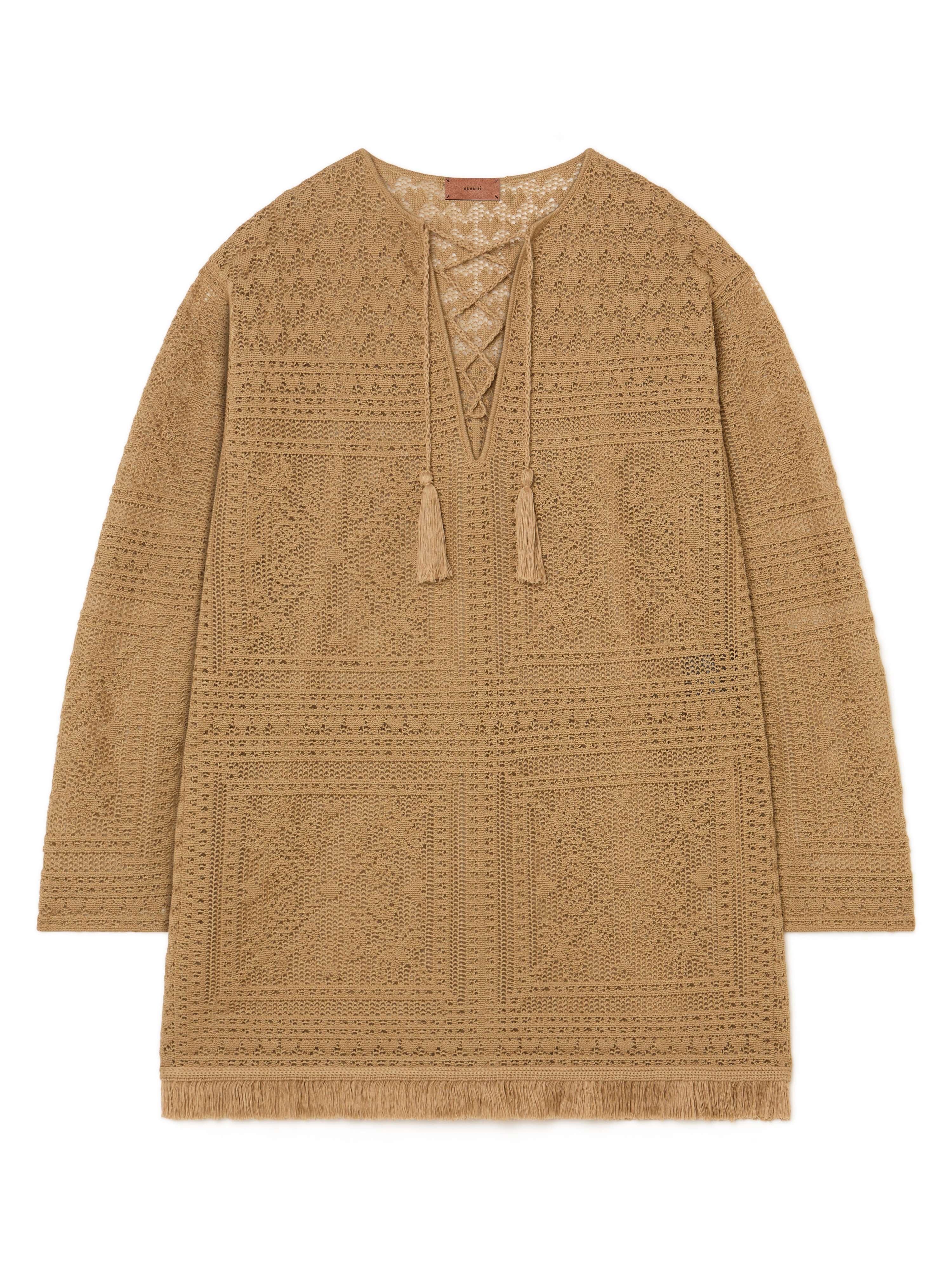 Romance returns for Spring/Summer 2025 with the Alanui family inspired by Baz Luhrmann's contemporary masterpiece Romeo + Juliet. Crafted from a cotton and cashmere blend in lace stitch, the Kiss by the Book Dress immortalizes a famous line with a motif of hearts and palm trees on a long-sleeved fit. Complete with handmade tassels, fringed edges and hand-crocheted buttons. DETAILS - Product Code LWHI05CR25KNI0011717 - Made In Italy - Crafted from 76% Cotton, 14% Cashmere, 10% Polyester. - This item weighs 455 gr and takes five hours to be knitted and another five to be assembled. - The model is 179 cm and wears a size M. - This item fits true to size.