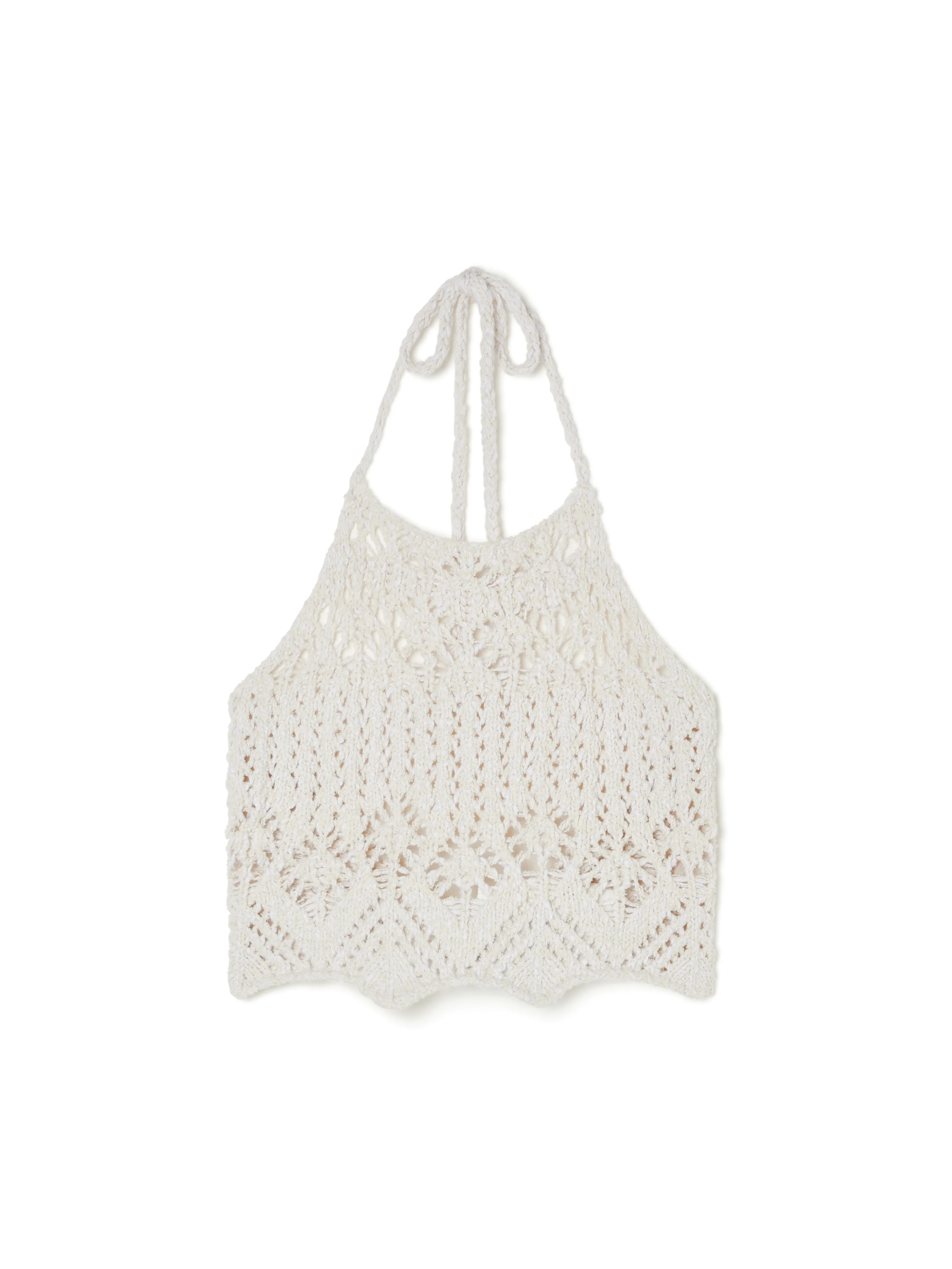 The Spring / Summer 2026 collection looks to the horizon where the water meets the sky. Crafted in Italy from soft cotton, the Lagoon Romance Top features intricate openwork knit and 3D cross-stitch detailing in a halterneck style with adjustable laces. DETAILS - Product Code LWHT010R26KNI001OFOF - Crafted from 96% Cotton 4% Polyamide Product weight: 150 grTaking two hours to be knitted and another one to be assembled. - The model is 180 cm and wears a size M/L. - The item fits true to size.