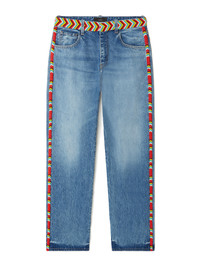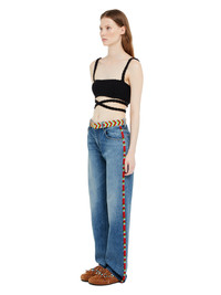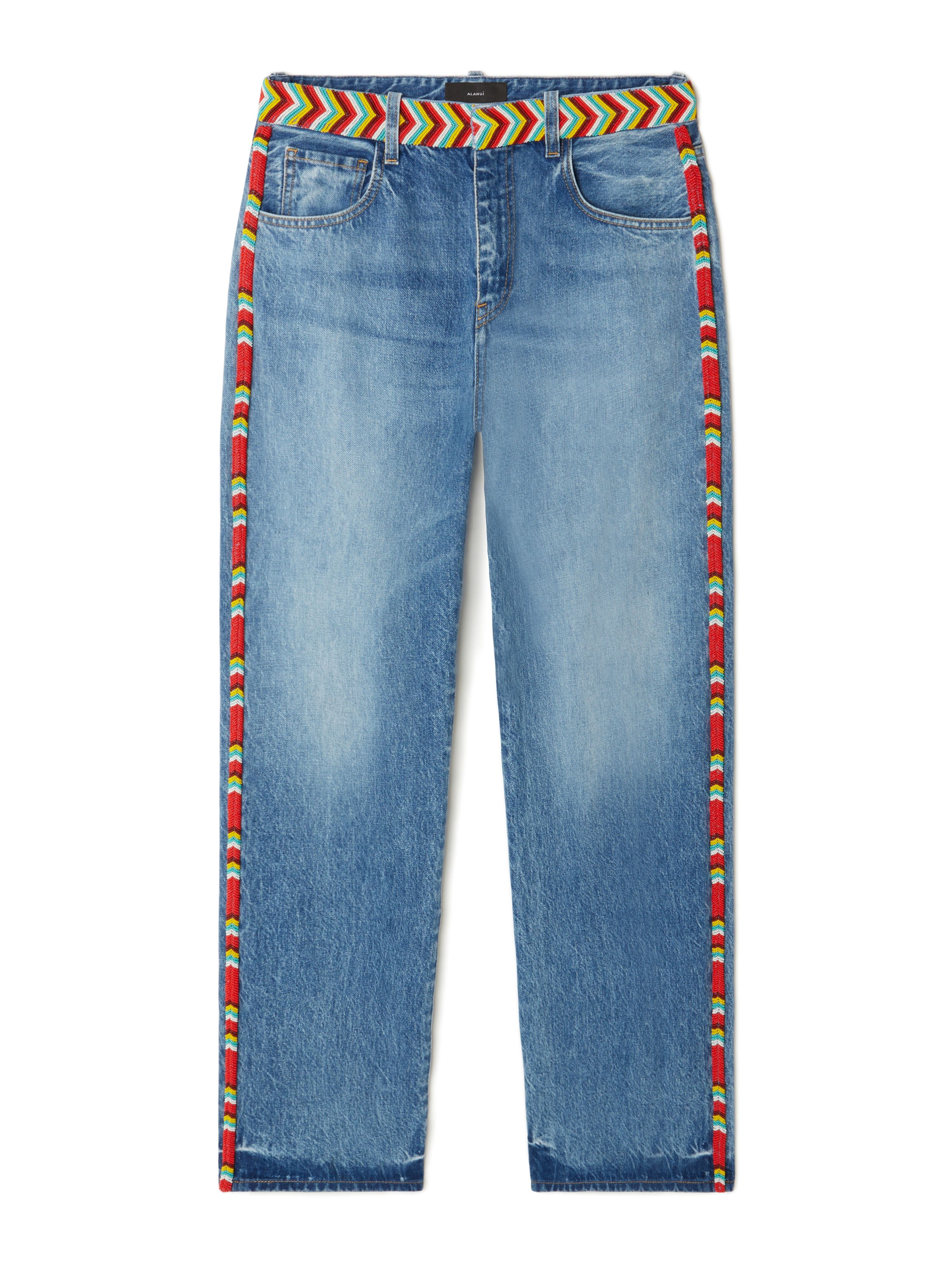The Spring/Summer 2025 collection travels to Africa for inspiration. Crafted from medium wash blue denim, the Memories of the Savannah Denim Pants feature a regular fit. A casual style hand-embroidered with colorful beading along the legs and waist. Style with matching cardigan. DETAILS - Product Code LWYA019R25DEN0014484 - Made In Italy - Crafted from 100% Cotton. Embroidery: 98% Glass, 2% Cotton. - The model is 176 cm and wears a size 27. - This item fits true to size.