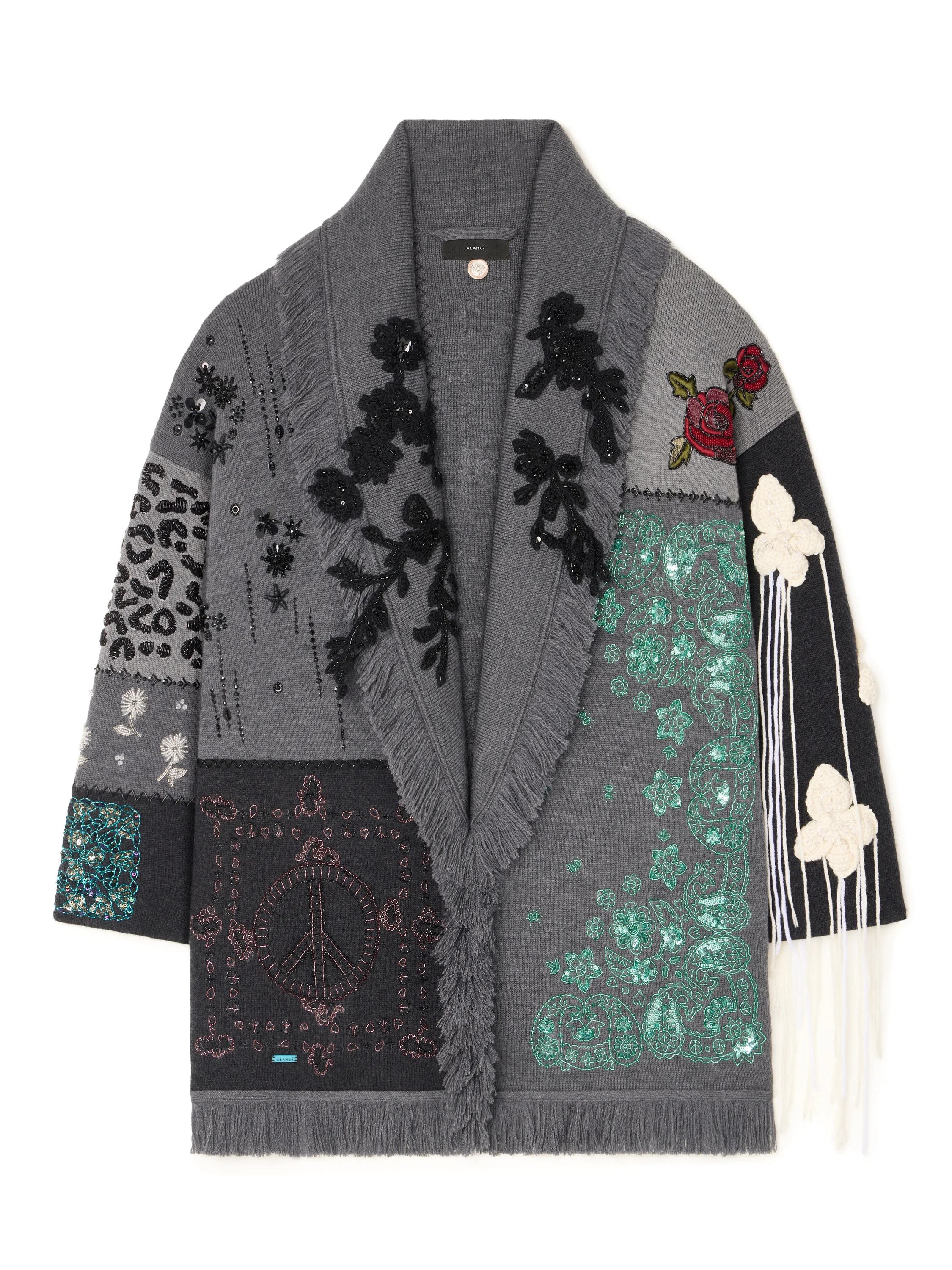 No trip around the world would be complete without a stop in New York City. Alanui channels the glamour of the Big Apple with a vibrant patchwork style in virgin wool. Made in Italy, the Midnight in Manhattan Cardigan features hand-crafted embroidery in different styles on the original Icon fit with a luxurious silk lining. Finished with a monotone tie-belt and fringed edges. DETAILS - Product Code LWHB064E25KNI0070784 - Crafted from Body: 100% Virgin Wool Linning:100% Silk Embroidery: 50% Glass 25% PVC 15% Wool 10% Cotton. - The model is 178 CM and wears a size M. - This item fits true to size.