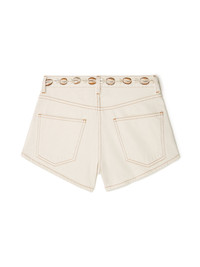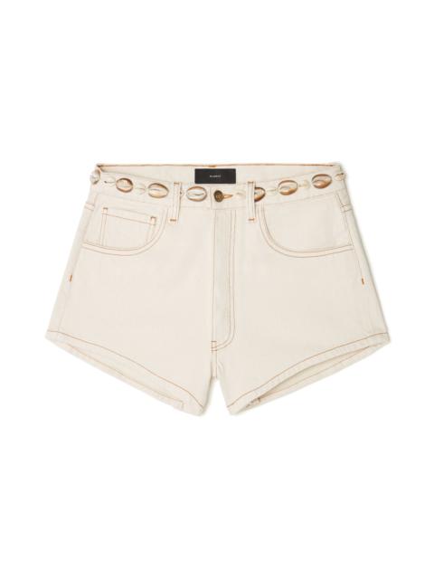 The Spring/Summer 2025 collection travels to the shores of Africa for inspiration. Crafted from white raw denim, the Ocean Dream Denim Shorts are embellished with hand-embroidered natural seashells. Style with matching bra for a beach-inspired total look. DETAILS - Product Code LWYC009R25DEN0030300 - Made In Italy - Crafted from 100% Cotton. Applications: 100% Seashell . - The model is 176 cm and wears a size 27. - This item fits true to size.