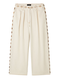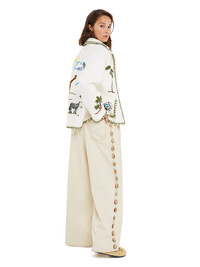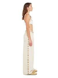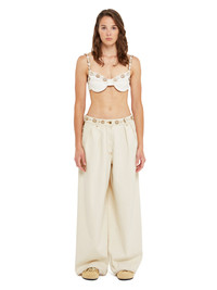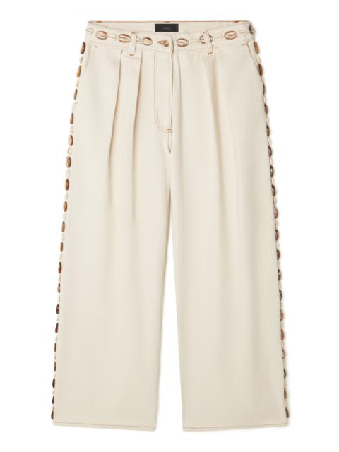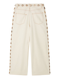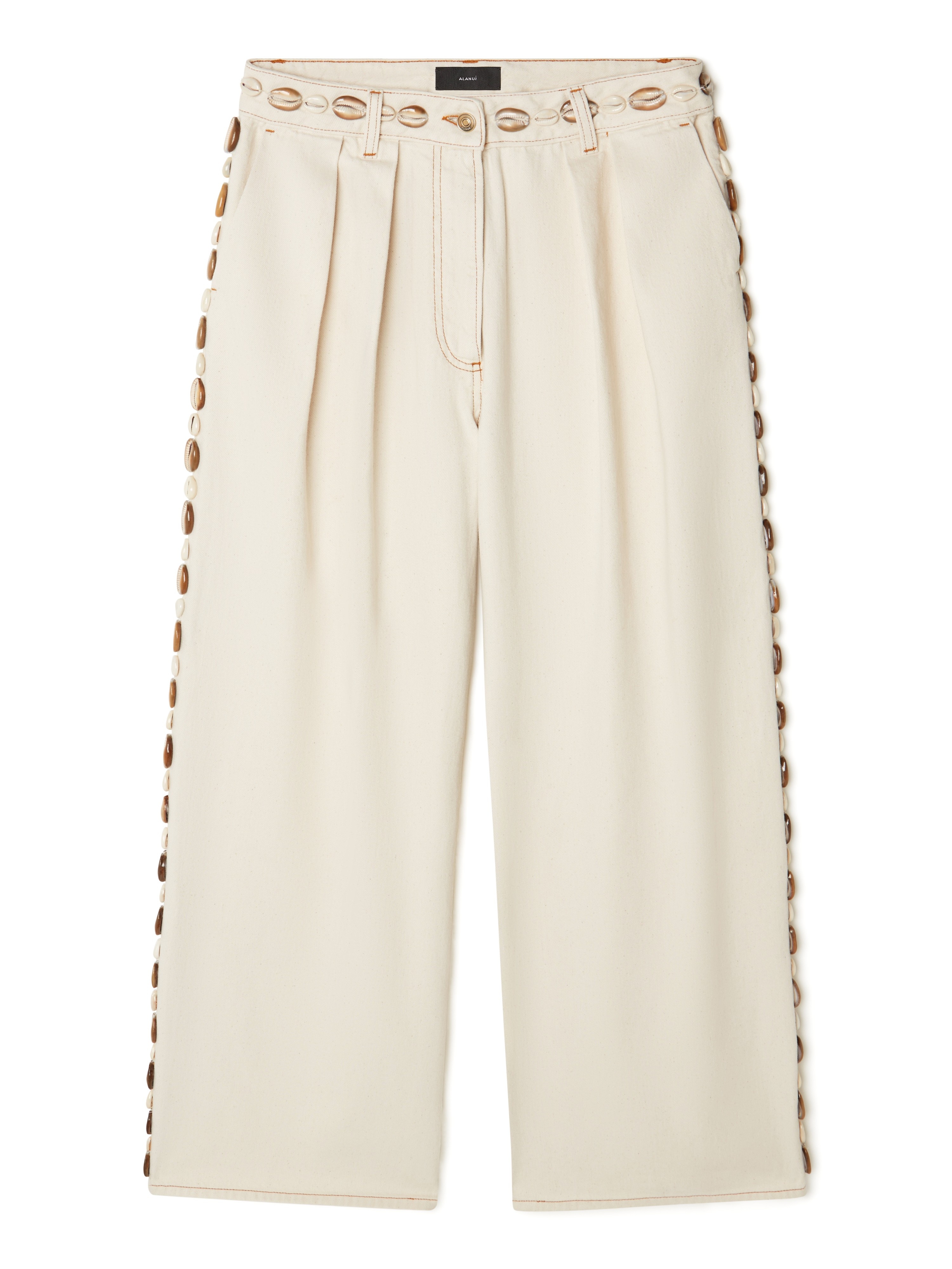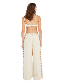 The Spring/Summer 2025 collection travels to the shores of Africa for inspiration. Crafted from white raw denim, the Ocean Dream Denim Pants feature a wide-leg fit embellished with hand-embroidered natural seashells. Style with matching bra for a beach-inspired total look. DETAILS - Product Code LWYB003R25DEN0020300 - Made In Italy - Crafted from 100% Cotton. Applications: 100% Seashell. - The model is 180 cm and wears a size 27. - This item fits wide.