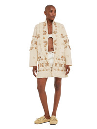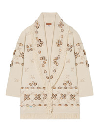 This Spring/Summer 2025, the signature Alanui cardigan transports you to the sun-soaked shores of Africa. Crafted from recycled silk and hand-embroidery, the Ocean Dream Cardigan is adorned with genuine natural seashells in an all-over pattern inspired by the beauty of the ocean. Featuring the signature Icon fit, hand-embroidered tie belt and matching fringed edges. DETAILS - Product Code LWHB064R25KNI00E03OF - Made In Italy - Crafted from 94% Silk, 6% Polyamide. Applications: 100% Seashell. - This item weighs 2404 gr and takes four hours to be knitted, six hours to be assembled and another eight to be embroidered. - The model is 177 cm and wears a size M. - This item fits true to size.