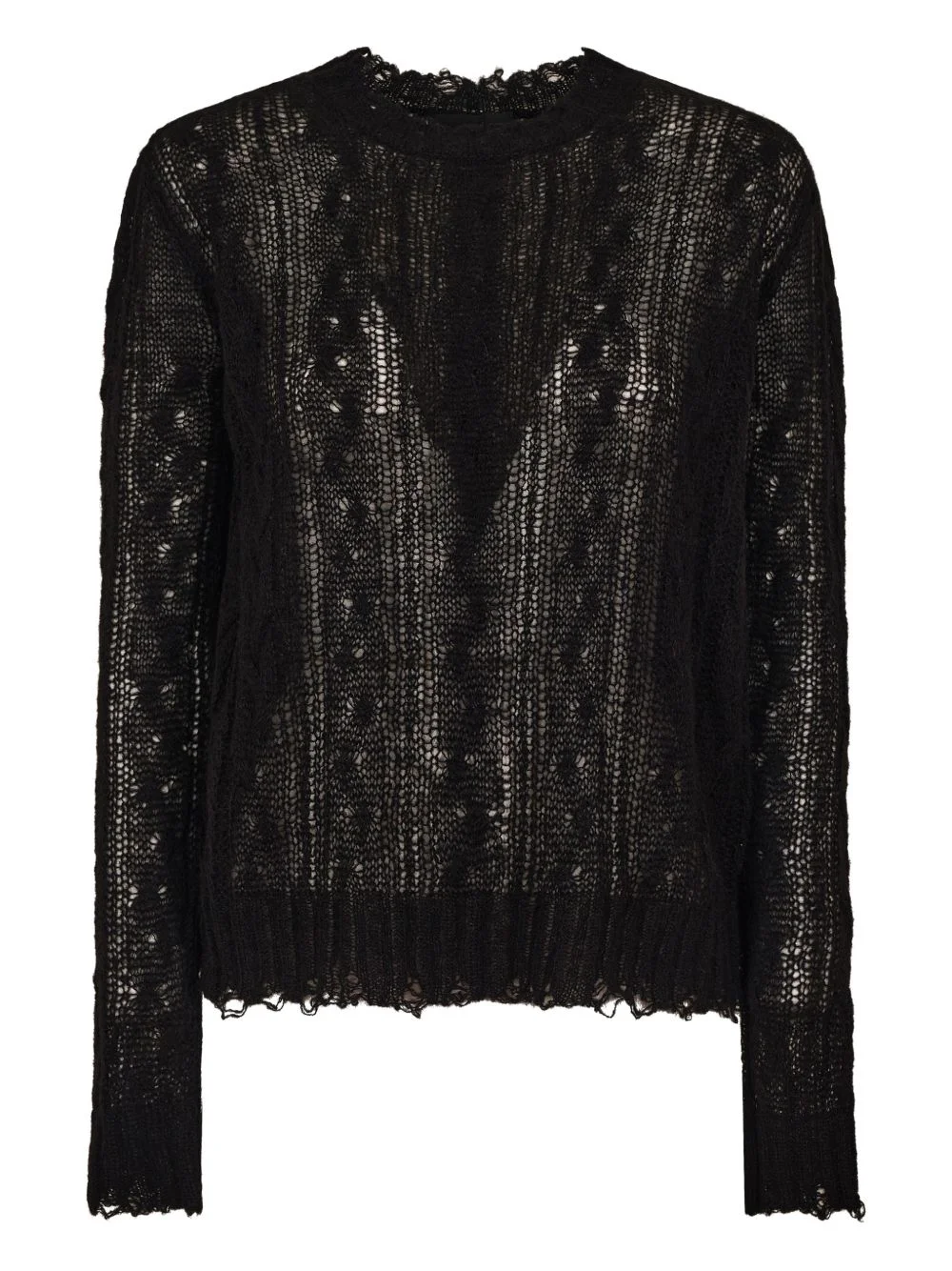 open-work ruffled jumper Highlights - Black - Openwork knit - Ruffled detail - Ribbed hem - Ribbed cuffs - Crew neck Made in Italy Composition Alpaca 40%, Cashmere 30%, Silk 30% Washing instructions Read Manufacturer Guidelines