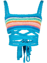 Over The Rainbow knitted bra Decorated with the brand's recognisable Over The Rainbow stripe at the front, Alanui presents this knitted bra. Crafted from cotton, it's secured with crossover self-tie fastenings at the back. Highlights - Blue/multicolour - Knitted construction - Crochet design - Sleeveless - Square neck - Crossover strap detail - Rear tie fastening Made in Italy Composition Cotton 100% SIZE & FIT Model measurements Height 5 ft 10 in(1.77 m) Bust/Chest 32.67 in(83 cm) Hips 35.43 in(90 cm) Waist 23.62 in(60 cm) FittingInformation Designed for a slim fit that sits just away from the body offering a close yet comfortable fit The tie fastening gives an adaptable and personalised fit Made with a midweight knit, this piece offers some stretch This piece fits true to size – take your usual size Washing instructions Dry Clean Only
