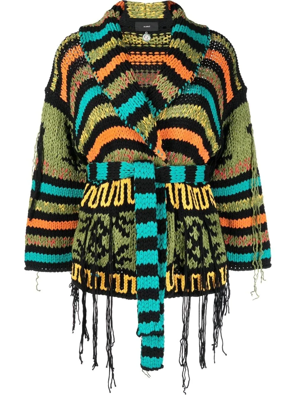 stripe-knit cardigan horizontal stripe pattern distressed effect frayed edge shawl lapels tied waist long sleeves Made in Italy Composition Cotton 53%, Polyamide 31%, Linen/Flax 13%, Wool 3% SIZE & FIT Model measurements Height 5 ft 10 in(1.78 m) Bust/Chest 30.31 in(77 cm) Hips 36.61 in(93 cm) Waist 24.8 in(63 cm) FittingInformation This piece fits true to size. We recommend you get your regular size Cut for a loose fit. Comes with an adjustable belt for a flexible fit at the waist Made with a mid-weight fabric Washing instructions Dry Clean Only