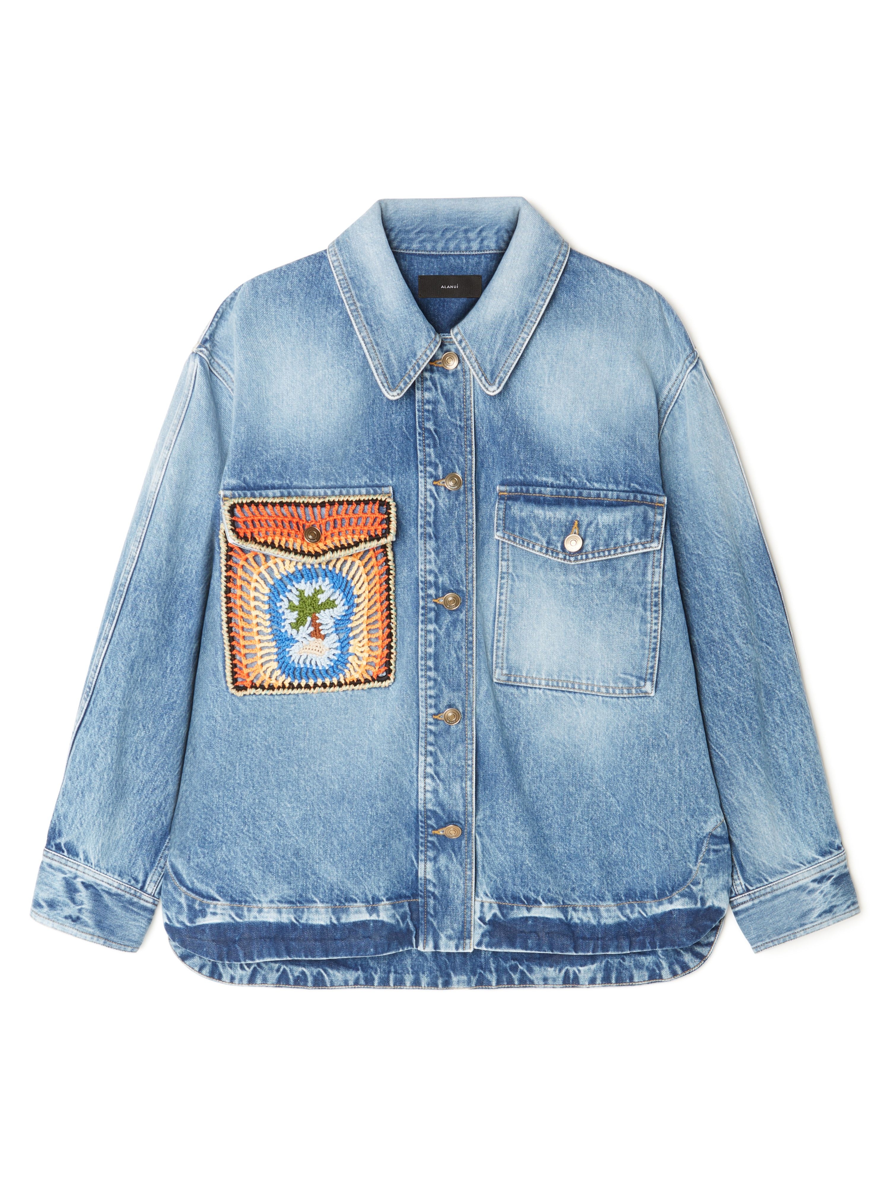 The Spring/Summer 2025 collection travels to Africa for inspiration. Crafted from medium wash denim, the Sunny Crochet Denim Shirt features an overshirt fit with ripped details for a subtle lived-in feel. An everyday style brightened up by vibrant crochet detailing on the pocket. Pair with matching pants for a colorful and casual total look. DETAILS - Product Code LWYD004R25DEN0014400 - Made In Italy - Crafted from 100% Cotton. - The model is 177 cm and wears a size M. - This item fits oversize.