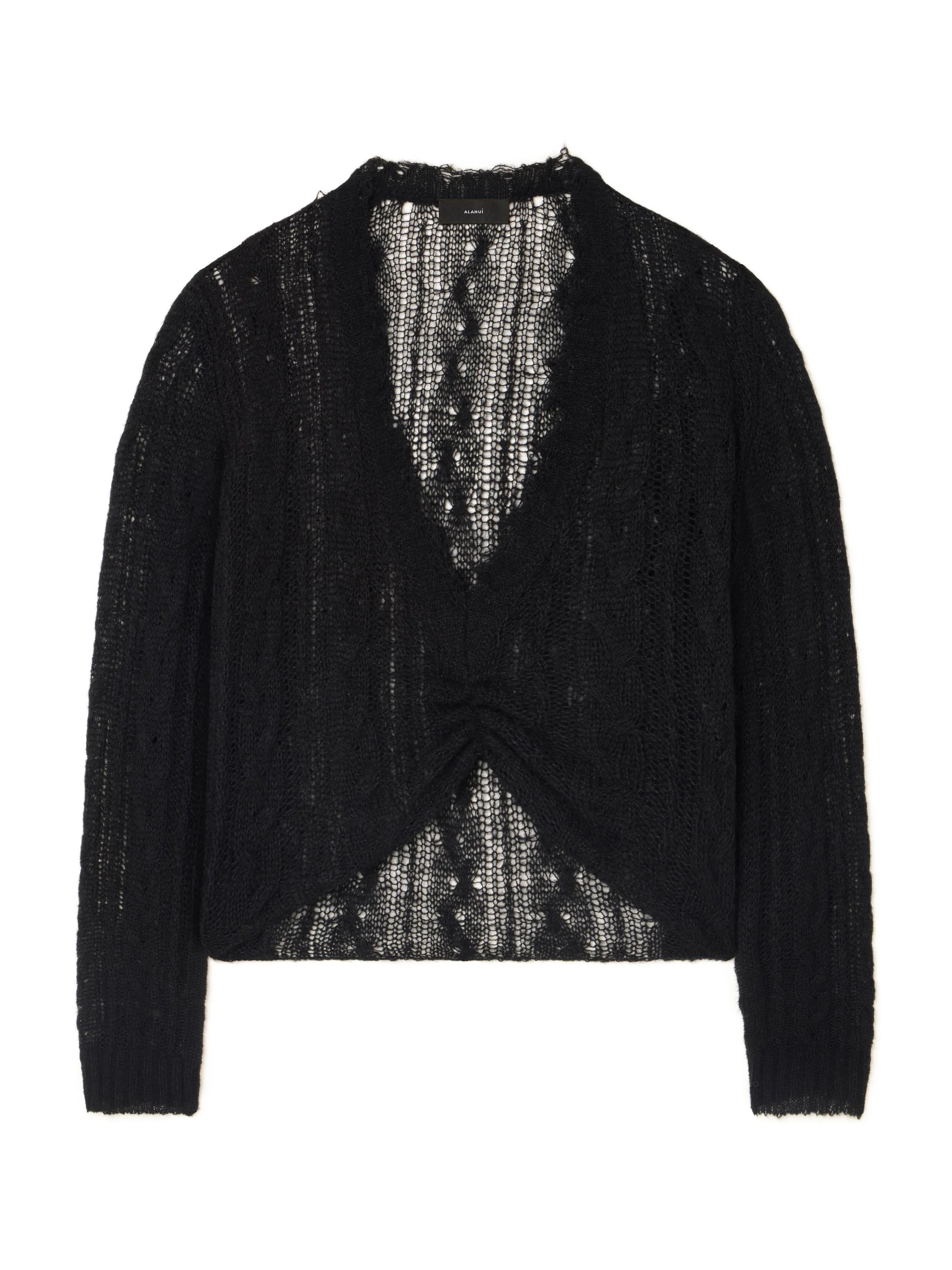 This Fall / Winter 2025, Alanui heads to the wilds of California. Inspired by the spirit of desert wanderers, the Desert Drift Cardigan V Neck features a draped V-neck style in a barely-there baby alpaca, cashmere, and silk blend. A braided motif in all-over cable stitch and distressed detailing evoke a lived-in feel. DETAILS - Product Code LWHD001E25KNI0011000 - Crafted from 40% Alpaca 30% Cashmere 30% Silk. - The model is 177 CM and wears a size M. - This item fits true to size.