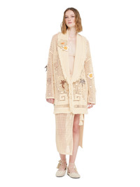 This Spring / Summer 2026, Alanui celebrates the art of finding beauty in simplicity. The Where the Waves Begin Cardigan reimagines fishing nets laden with treasures from the sea through intricate net stitching, delicate mother-of-pearl details, and all-over brooches. Crafted from soft cotton in the original Icon fit, it features a rolling wave motif, a matching tie belt, and fringed edges. DETAILS - Product Code LWHB064R26KNI0130F0F - Crafted from 76% Cotton 24% Polyamide Applications: 50% Mother-of-pearl, 20% Cotton, 10% Acrylic, 8% Wool, 8% Viscose, 4% Glass Product weight: 1250 grTaking six hours to be knitted and another six to be assembled. - The model is 180 cm and wears a size M. - The item fits true to size.