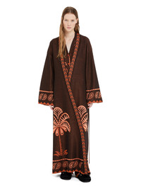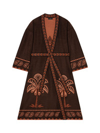 This Spring/Summer 2025, Alanui celebrates the splendor of the natural world. Crafted in Italy from a silk blend using double jacquard technique, the Wild Wonder Kimono features a robe fit and a textured foulard motif. Complete with a geometric tie belt. DETAILS - Product Code LWHC001R25KNI0011075 - Made In Italy - Crafted from 76% Silk, 15% Viscose, 9% Polyester. - This item weighs 670 gr and takes four hours to be knitted and another five to be assembled. - The model is 176 cm and wears a size M. - This item fits true to size.