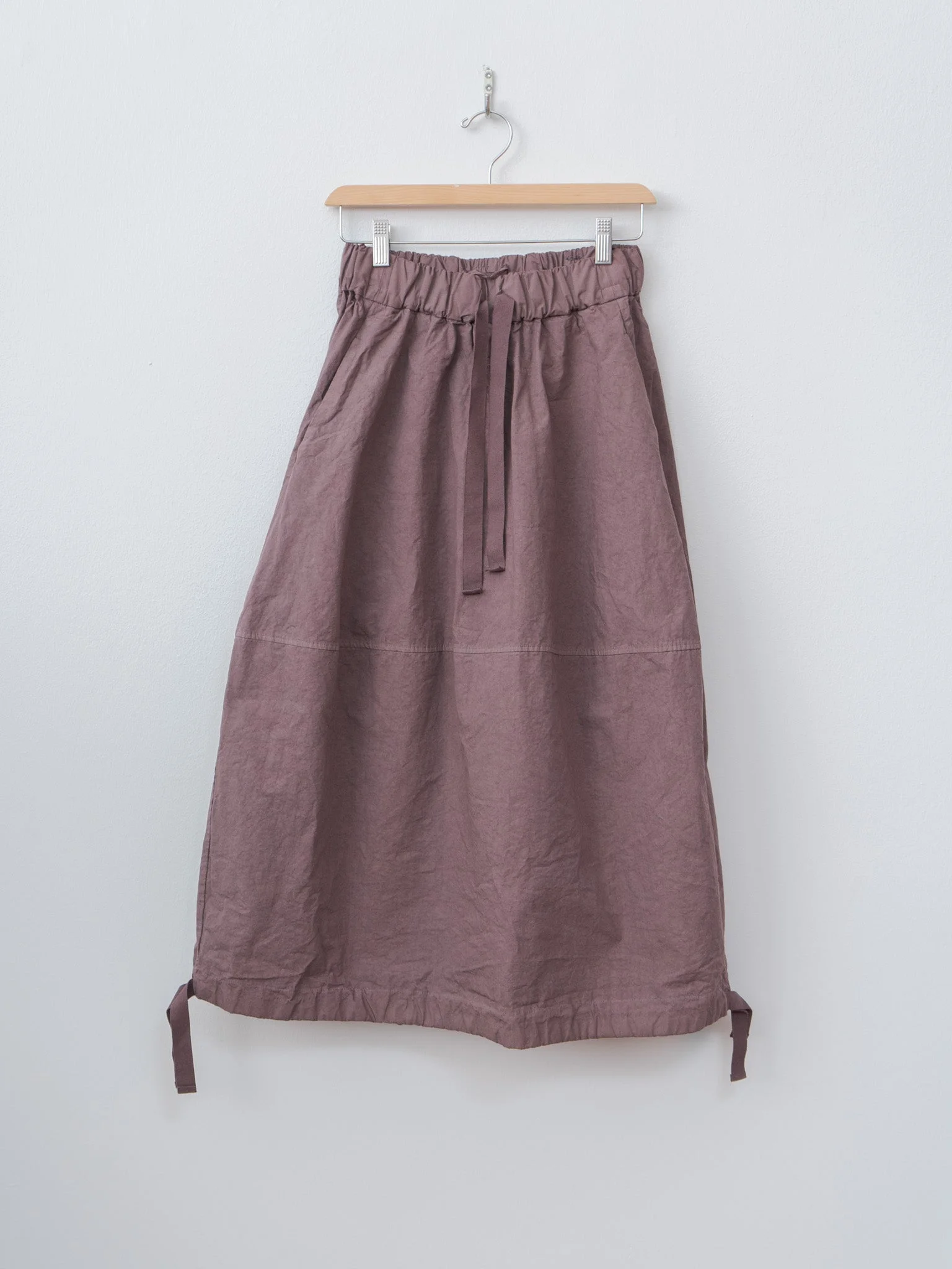 An A-line skirt featuring an adjustable hem with side drawstrings that can be tightened to create a balloon shape. It is crafted from a midweight compact cotton that feels structured yet breathable with a smooth hand. Details include an elasticated waist with drawstrings and side pockets. - Made in Italy - 100% Cotton - Available in Mauve, Thyme, and Pebble - The model is 5'8"/173cm and wears size S
