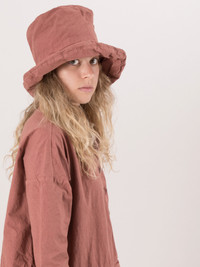 A structured bucket hat from Album di Famiglia featuring a double layer of their signature CC (compact cotton) and TC (paper cotton) fabrics. It features a medium length brim and an exaggerated crown. - Made in Italy - 100% Cotton - Available in Stone and Coral - Approximate circumference: 22.4" on S, 23" on L. Model wears size S in Coral.