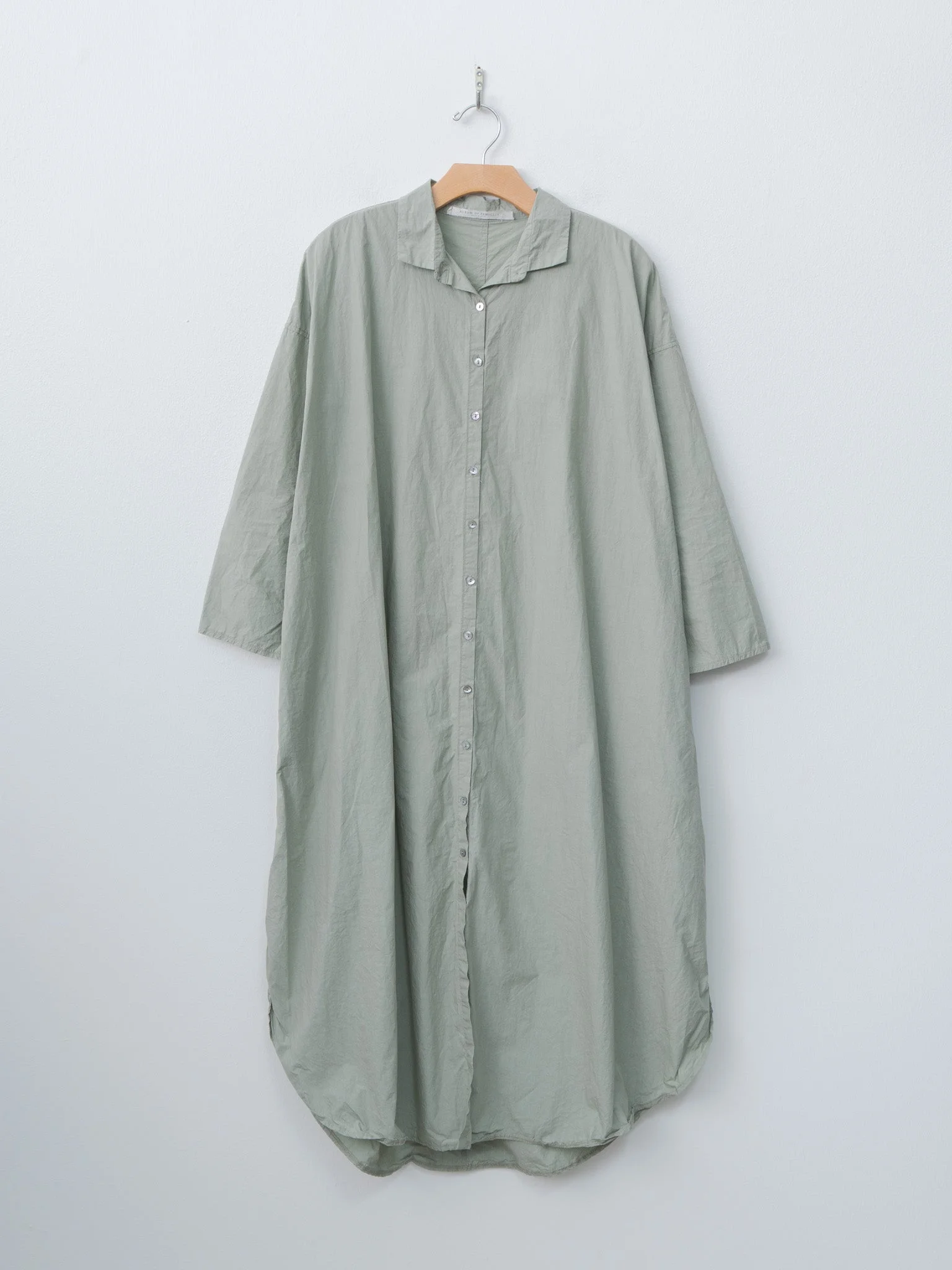 A midi length, relaxed fitting shirt dress made from AdF's signature lightweight paper cotton. Details include a point collar, rounded hem with side splits, side seam pockets, 7/8 length sleeves, and a curved hem with a slightly longer length on the back. Wear it as a dress or as a light spring layer with tees and trousers. - Made in Italy - 100% Cotton - Available in Thyme, Pebble, and Sage - The model is 5'8"/173cm and wears size S - Only available in sizes S and L