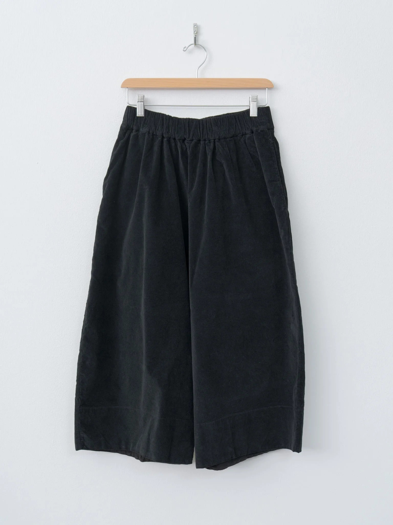 A voluminous, wide leg trouser from Album di Famiglia made in a lightweight, soft and stretchy cotton velvet. It features a drop crotch, elasticated waist with drawstrings, side pockets and back patch pockets. This style is wider and more cropped than the Wide & Short trousers. - Made in Italy - 97% Cotton 3% Elastane - Available in Black, Ink, and Marron Glace - The model is 5'7"/170 cm and wears size S