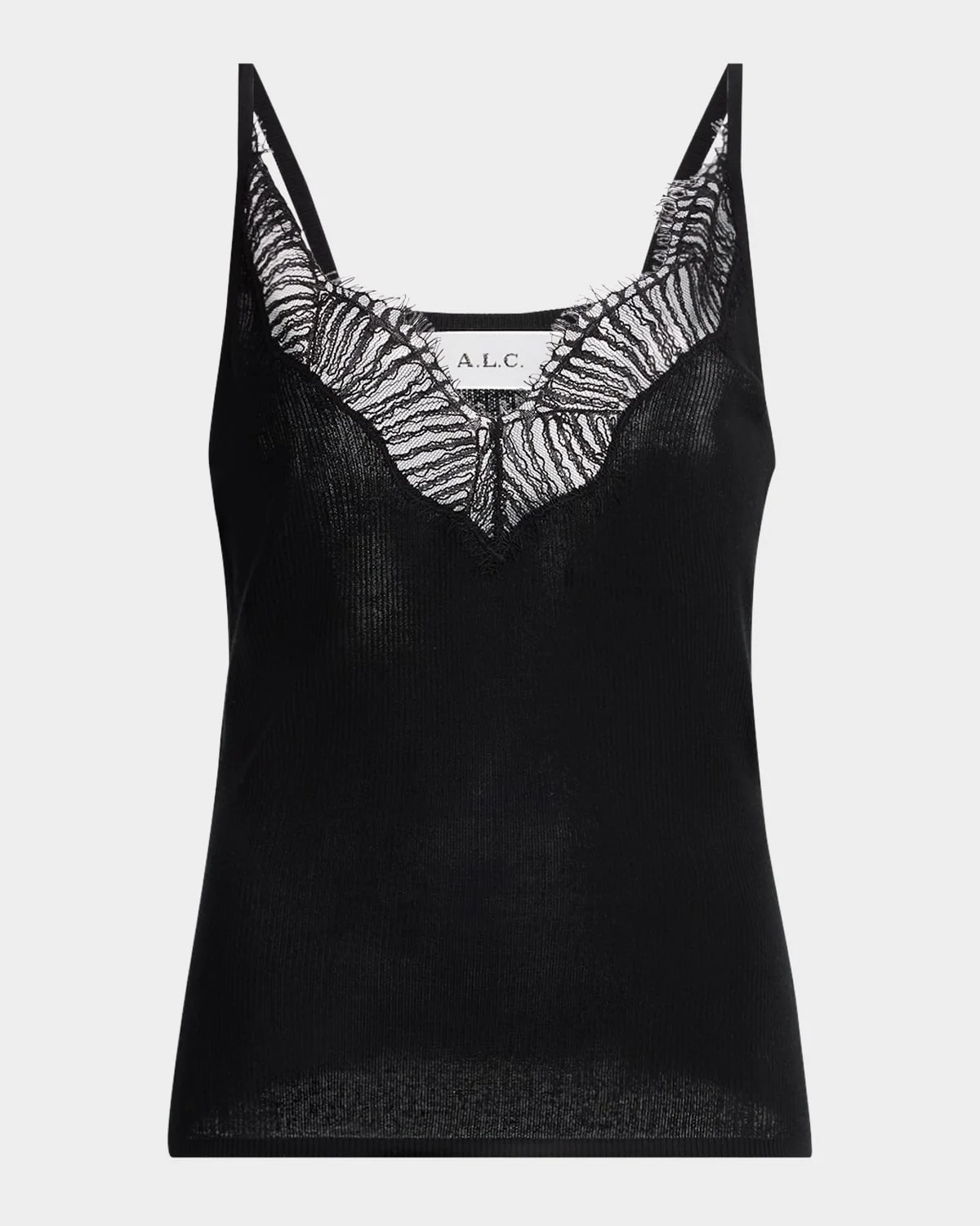 A.L.C. "Alba" silk cami top with lace trim V neckline Sleeveless Easy fit Hem sits at the hip Pullover style Silk Unlined Dry clean Imported