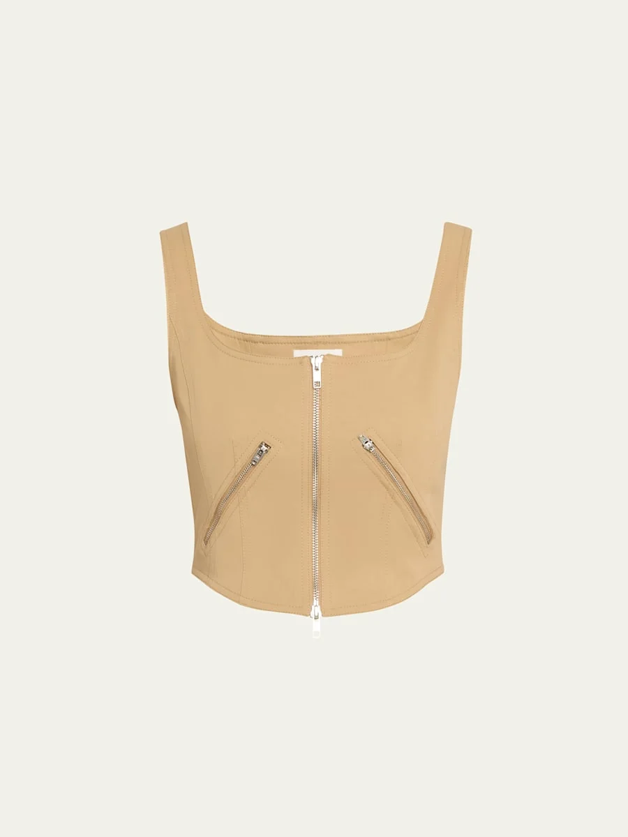 A.L.C. "Dea" corsetstyle top Scoop neckline Sleeveless Angled zip pockets Cropped fit Twoway zipfront Cotton/elastane Unlined Dry clean Imported