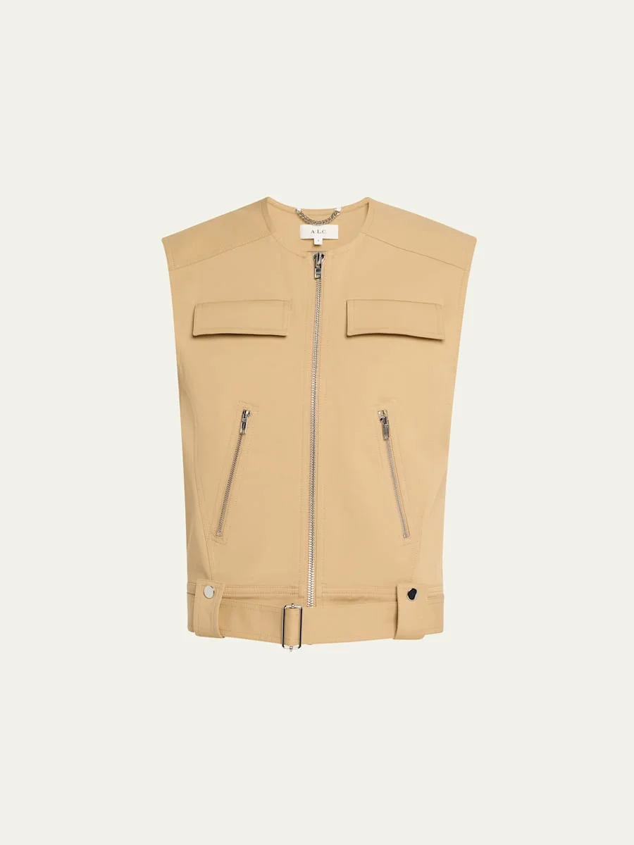 A.L.C. "Cal" utilityinspired jacket Round neckline Sleeveless Chest flap pockets Angled zip pockets Boxy fit Belted hem Zipfront Cotton/elastane Lining: Cotton/polyester Dry clean Imported