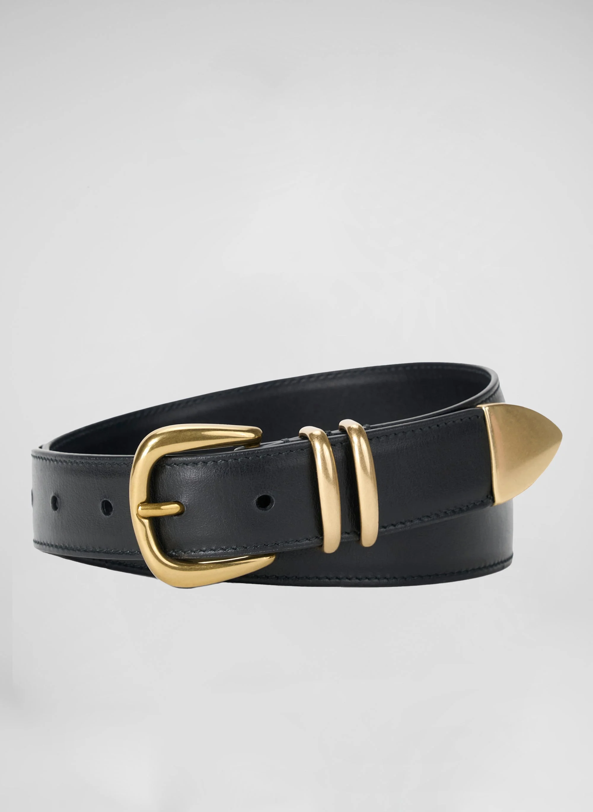 The Carson Belt is crafted from smooth leather in classic black and finished with lustrous gold-tone hardware. This timeless silhouette is made in Italy and features a curved buckle, twin gold loops, and a sculpted tip—all rendered in polished metal for a sleek, refined look. Shop Accessories. Styling Tip: Cinch it over dresses for contrast or loop it through jeans to elevate the everyday. SIZE & FIT - Length By Size: XS - 29.375", S - 31.375", M - 33.375", L - 35.375", XL - 37.375" DETAILS - Style ABELT00006 - 100% Leather, Exclusive of Buckle - Spot Clean - Not Lined - Buckle Closure