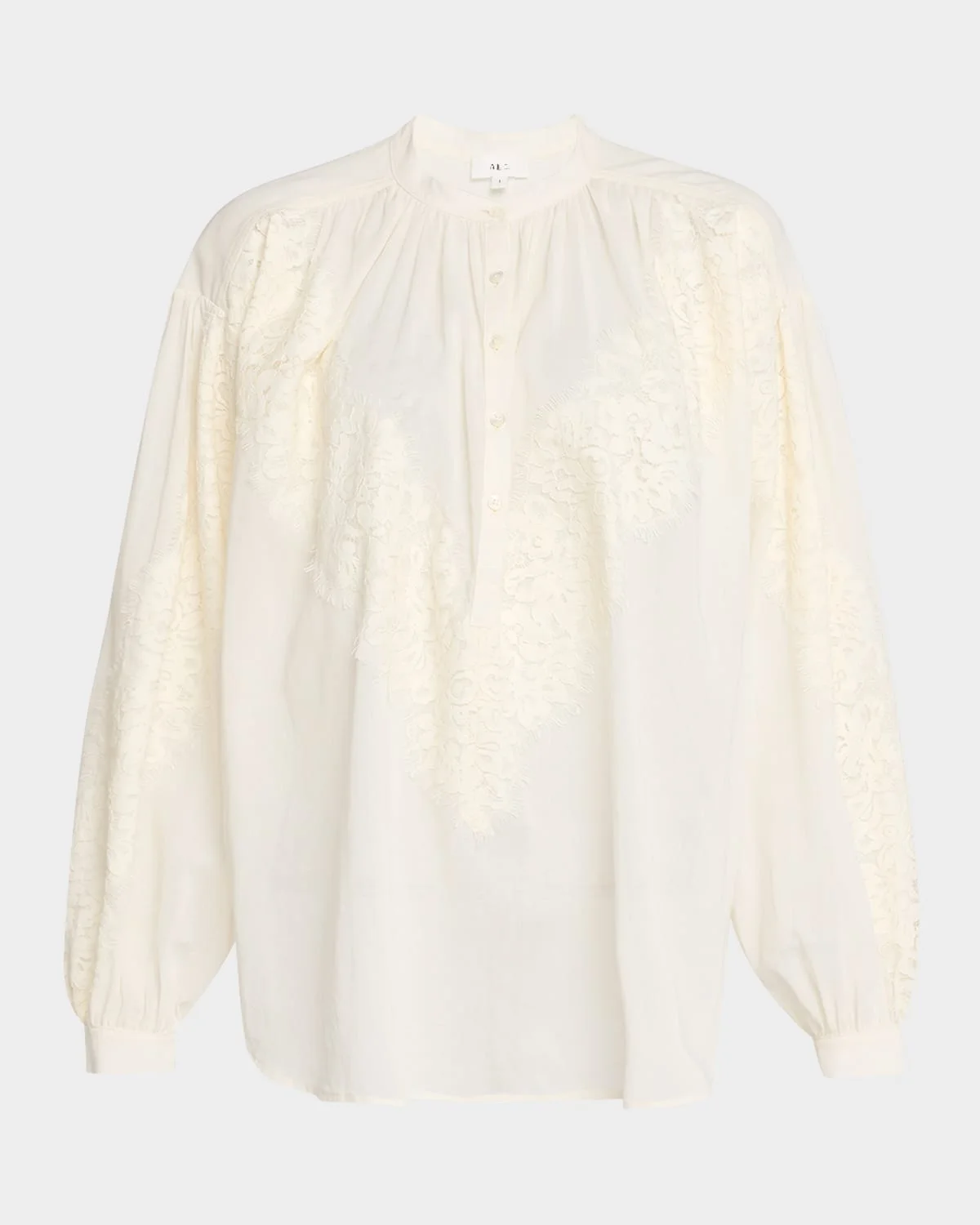 A.L.C. "Elaine" lace embroidered top High neckline; buttonplacket Dropped shoulders Long sleeves with button cuffs Loose fit Hem falls to the hip Cotton Unlined Dry clean Imported