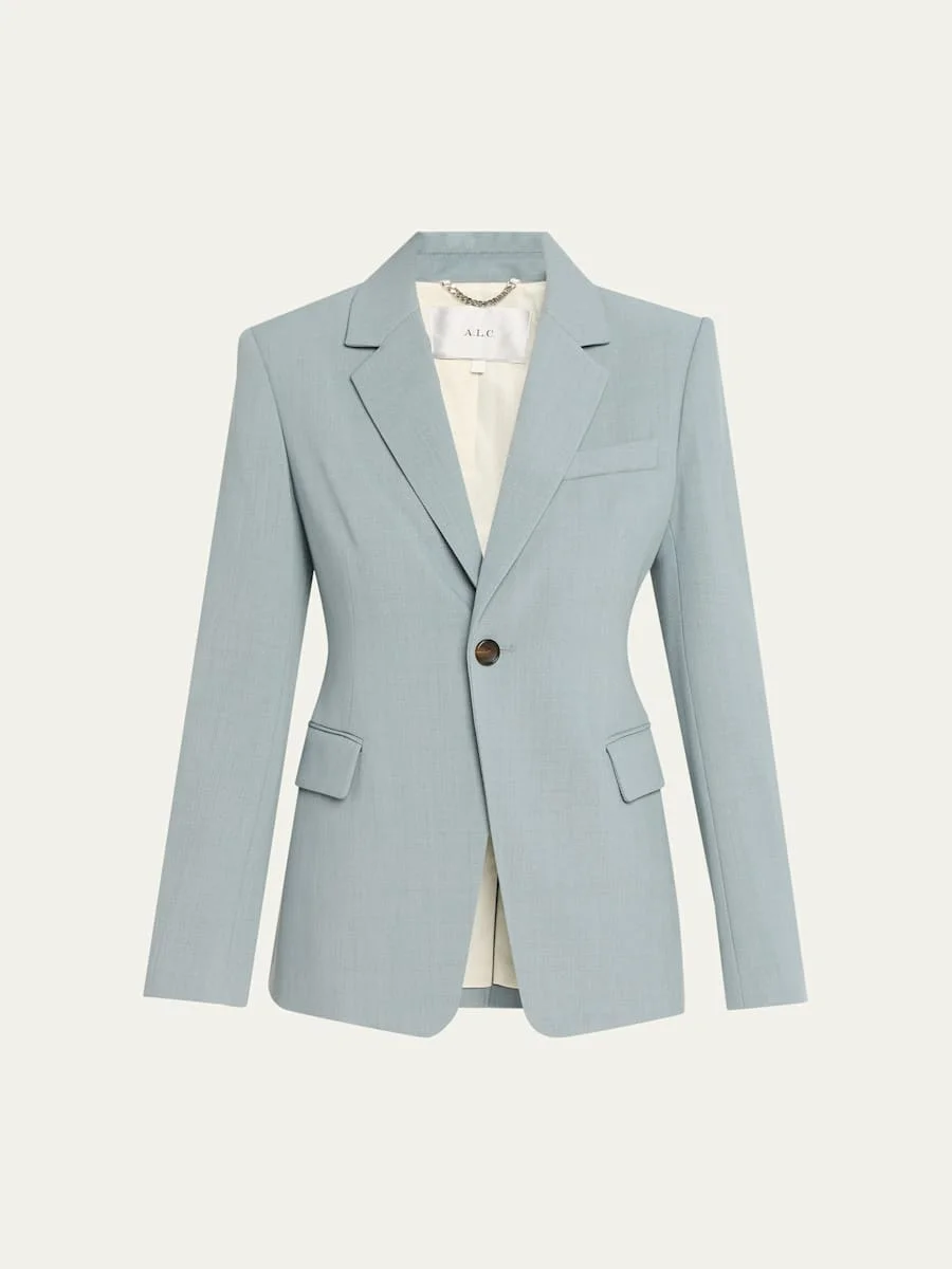 A.L.C. "Elza" classic woolblend blazer finished with a singlebreasted front Notch lapels Long sleeves with button cuffs Chest welt pocket Hip flap pockets Tailored fit Cutaway hem Back vent Buttonfront Wool/viscose/polyester Dry clean Imported