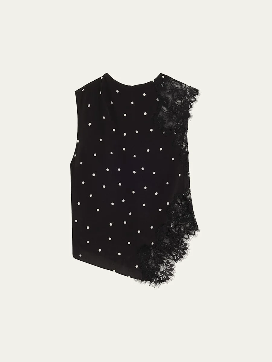 The "Gracie" blouse by A.L.C. is crafted from polkadot crepe with delicate asymmetric lace trim Approx. 26.3"L from shoulder to hem High neckline Sleeveless Classic fit Hip length Back keyhole/buttonandloop closure Viscose Unlined Dry clean Imported