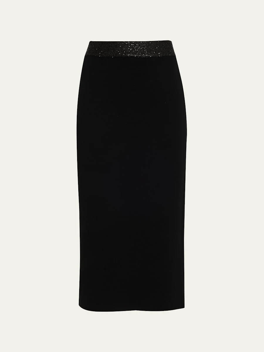 A.L.C. "Jane" knit midi skirt featuring an embellished waistband High rise Elastic waistband Bodycon fit Hem falls below the knee Pullon style Viscose/polyester Dry clean Imported
