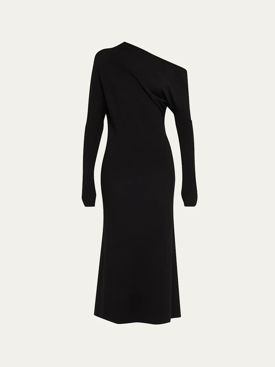 A.L.C. "Liv" draped fine merino midi dress Oneshoulder neckline Long sleeves Fitandflare silhouette Full length Slipover style Merino wool/polyester Unlined Dry clean Imported