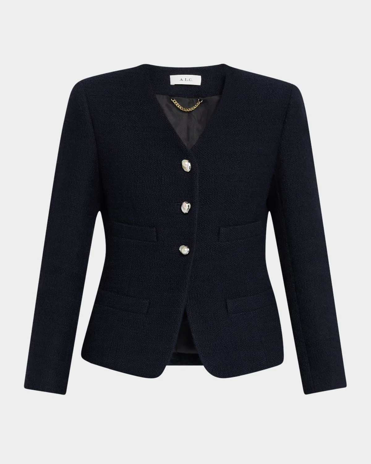 A.L.C. "Luca" tweed jacket featuring pearly buttons V neckline Bracelet sleeves Welt pockets Tailored fit Cutaway hem Buttonfront Polyester Imported