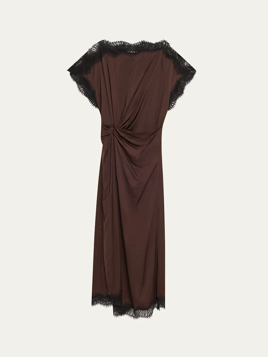 Crafted in signature satin viscose, the "Luna" midi dress by A.L.C. features a flattering ruched waist and contrasting lace trim for a touch of elegance. Bateau neckline Short flutter sleeves Aline silhouette Hem falls below the knee Invisible zip closure Viscose Dry clean only Imported