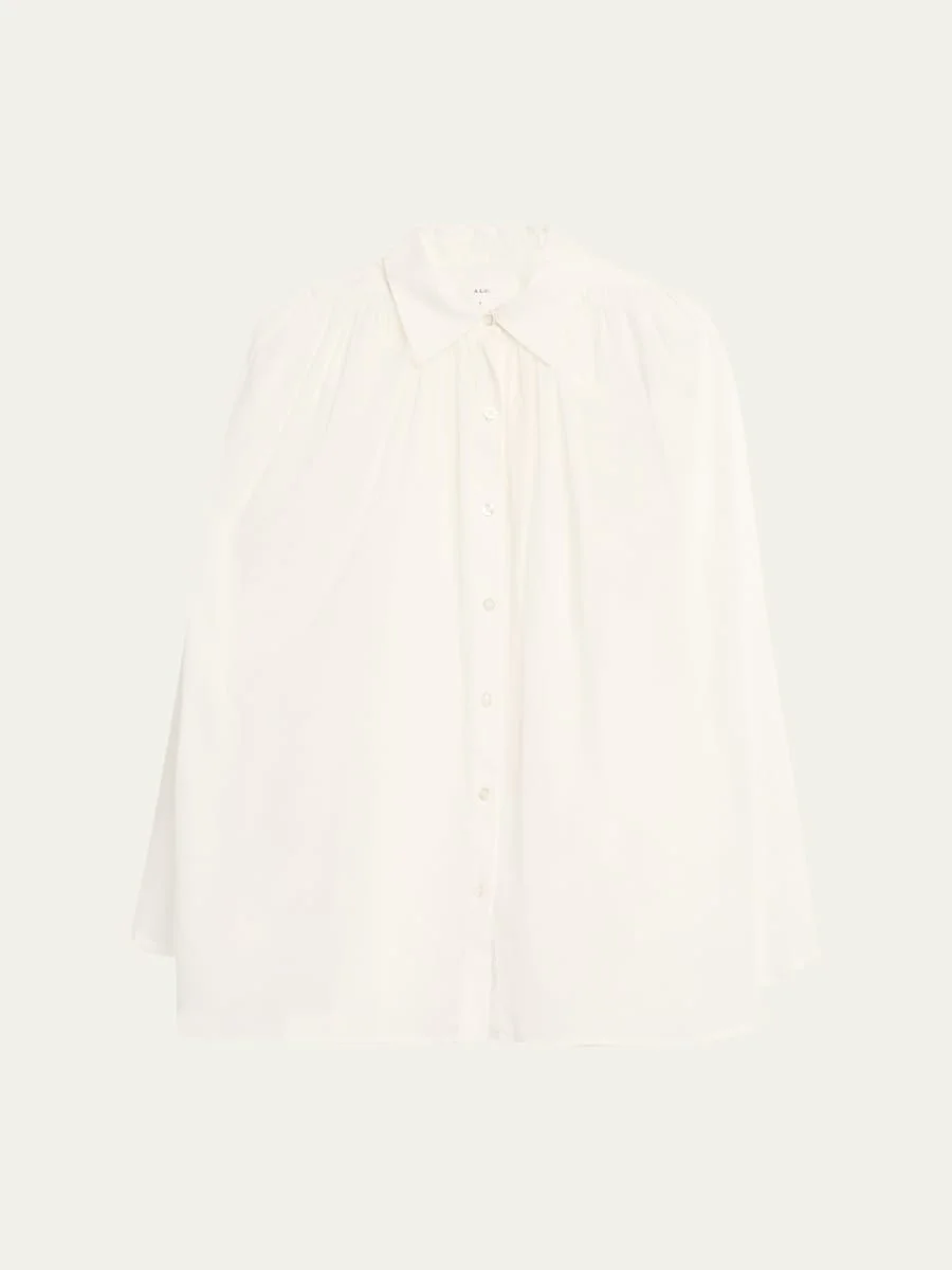 A.L.C. "Nessa" cotton top with gathering at the shoulders Point collar Cap sleeves Loose fit Hem falls to the hip Buttonfront Cotton Unlined Dry clean Imported