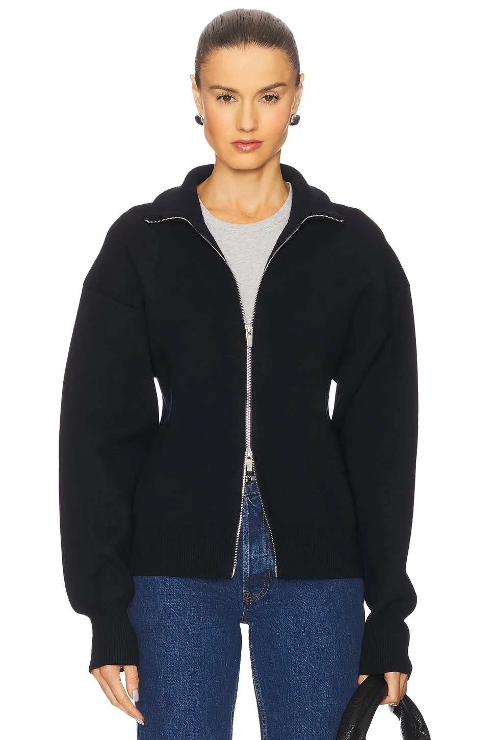 - 72% viscose 28% polyester - Dry clean only - Zipper closure - Ribbed collar, cuffs, and hem - Side welt pockets with hidden zipper closures - Midweight knit fabric - Revolve Style No. ALX-WK121 - Manufacturer Style No. 7SWCA00209