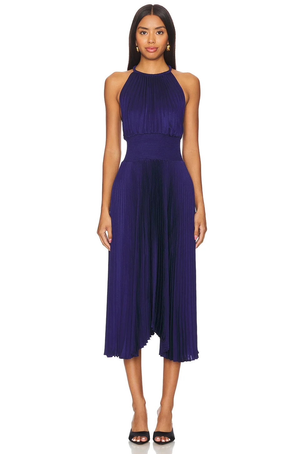 - 100% polyester - Made in China - Hand wash - Unlined - Pull-on styling - Smocked waist Back keyhole cut-out with loop button closure - Midweight plisse fabric with ruffle hem - The Renzo II Dress from A - L.C - has a halter neckline and smocked waist - The pleated satin fabric is perfect for any special event! - Revolve Style No. ALX-WD452 - Manufacturer Style No. 6CDRS01606