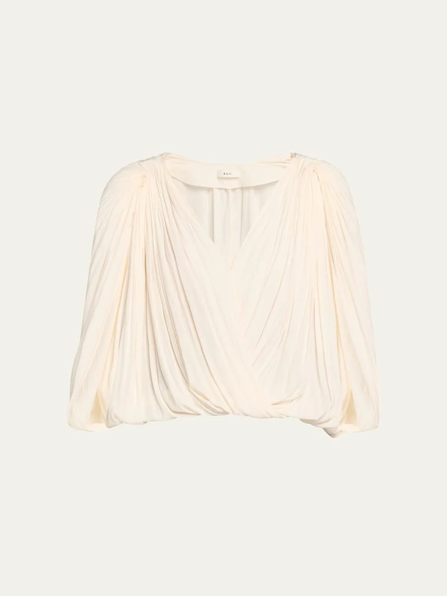 A.L.C. "Vivian" draped top Surplice neckline 3/4 cape sleeves Elasticized hem Relaxed fit Pullover style Polyester Unlined Dry clean Imported