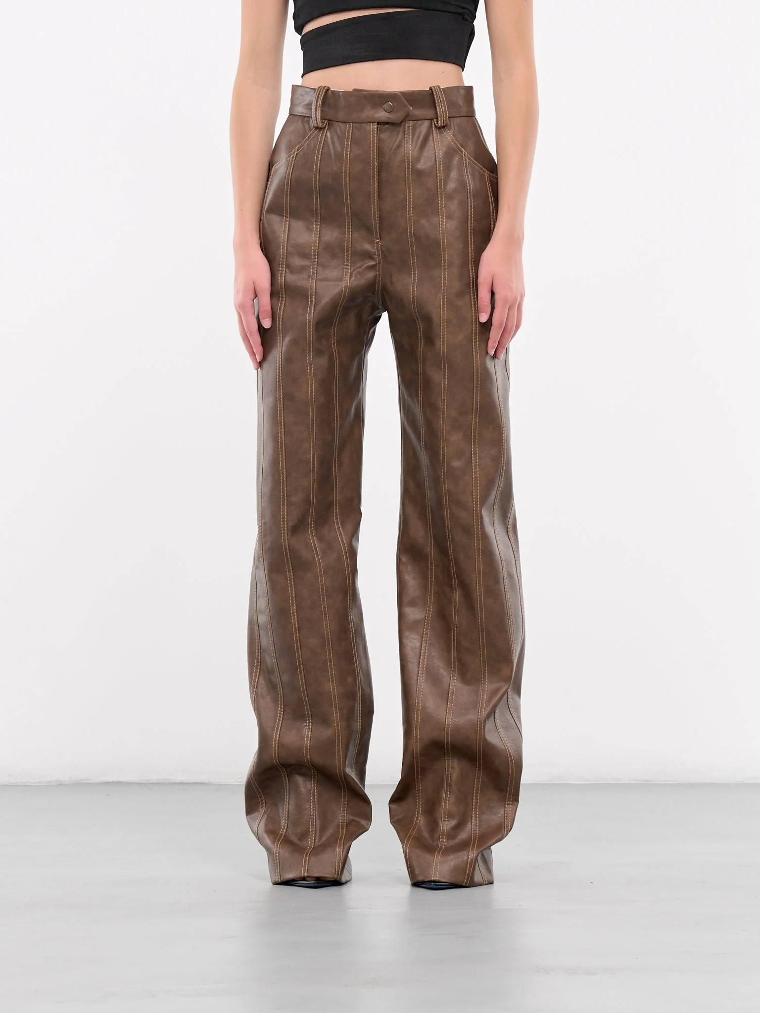 ALEKSANDRE AKHALKATSISHVILI pants in brown, paneled vegan leather construction, paneling throughout, high waist, belt loops, integrated belt, inset pockets, back patch pockets & logo flag, lined, straight leg, regular fit. Made in Georgia Outer: 50% Polyurethane 50% Polyester Inner: 100% Cotton Standard Sizing