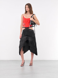 ALEKSANDRE AKHALKATSISHVILI skirt in black, poly-viscose blend, paneled construction, fringing throughout, adjustable pin-buckle strap waist, side cut-outs, angled hem, lined, midi-length, fitted. Made in Georgia Outer: 64% Polyester 34% Viscose 2% Lycra Fringe: 100% Polyester Inner: 100% Cotton Standard Sizing