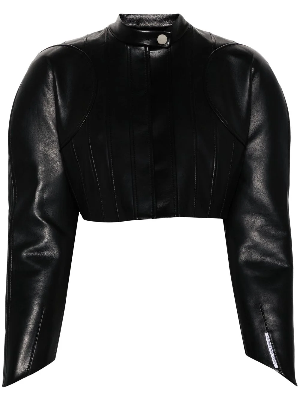shoulder-pads cropped biker jacket Highlights - Black - Faux leather - Smooth grain - Seam detailing - Logo patch at the sleeve - Band collar - Front press-stud fastening - Shoulder pads - Long sleeves - Straight hem - Cropped - Full lining Imported Composition Lining: Polyester 100% Outer: Polyurethane 50%, Polyester 50% SIZE & FIT Model measurements Height 5 ft 10 in(1.78 m) Bust/Chest 33.46 in(85 cm) Hips 36.22 in(92 cm) Waist 23.22 in(59 cm) FittingInformation Designed for a slim fit that sits just away from the body offering a close yet comfortable fit The internal shoulder pads offer a structured shape Made from a midweight non-stretch fabric This piece fits true to size – take your usual size